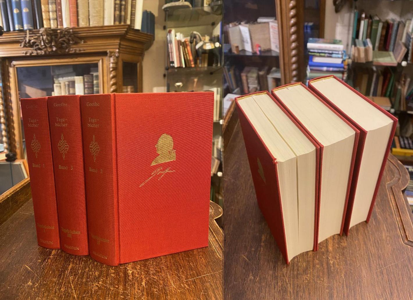 Goethe, Johann Wolfgang von (1749-1832). – Baumann, Gerhard (Hrsg): Johann Wolfgang Goethe : Tagebücher [in drei Bänden]: BAND I: 1770 – 1810.– BAND II: 1811 – 1823.– BAND III: 1824 – 1832. 3 Bände in 3, [Essen], Phaidon Verlag, [1982]. 8° (18x12), 1021; 1139; 1062 S., Dünndruckpapier, rote Oln mit goldPrägung, Lesebändchen, ohne Gebrauchsspuren, sehr schön, [= Goethes : Gesamtausgabe der Werke und Schriften in 22 Bänden : Abteilung 2 (Schriften); 11 – 12 – 13], Auswahl der Gedichte unter Mitwirkung von Georg von der Vring.–