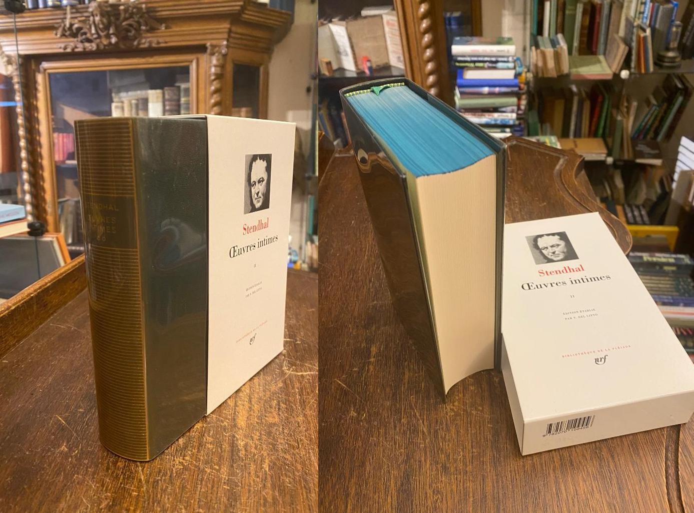 Stendhal [i.e. Marie-Henri Beyle] (1783-1842). – Del Litto, Victor (ed): Stendhal : Oeuvres intimes II : Edition etablie par V. Del Litto. Paris, Edition Gallimard, 1982. 8° (18x11), XIV, 1717 p., papier bible, reliure d’editeuer plein cuir vert, dos dore, avec jaquette dans etui, comme neuf, [= Bibliotheque de la Pleiade; 304], Ce volume faisant partie (vol II de deux) d’une nouvelle edition de ‚Oeuvres intimes de Stendhal‘.–