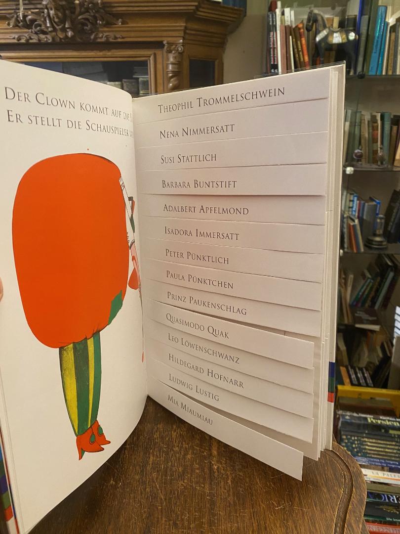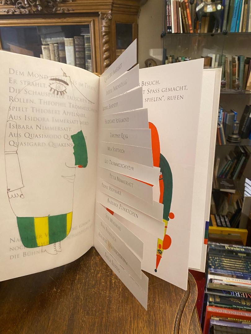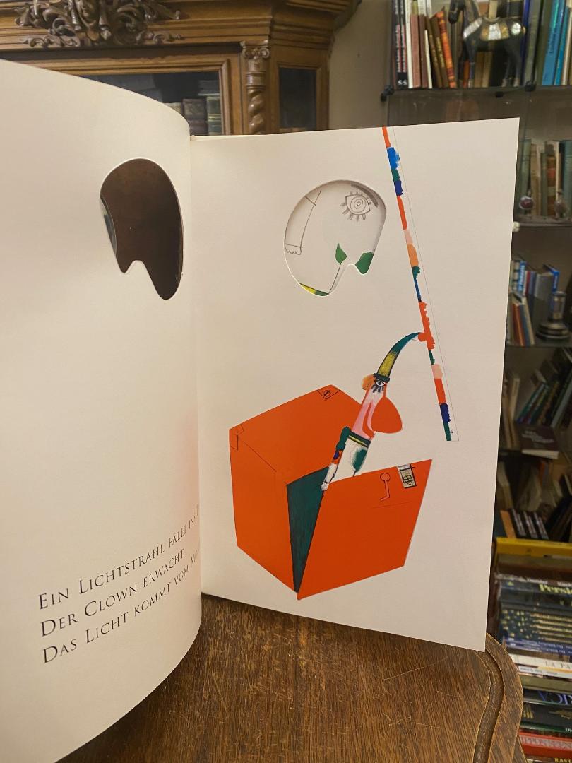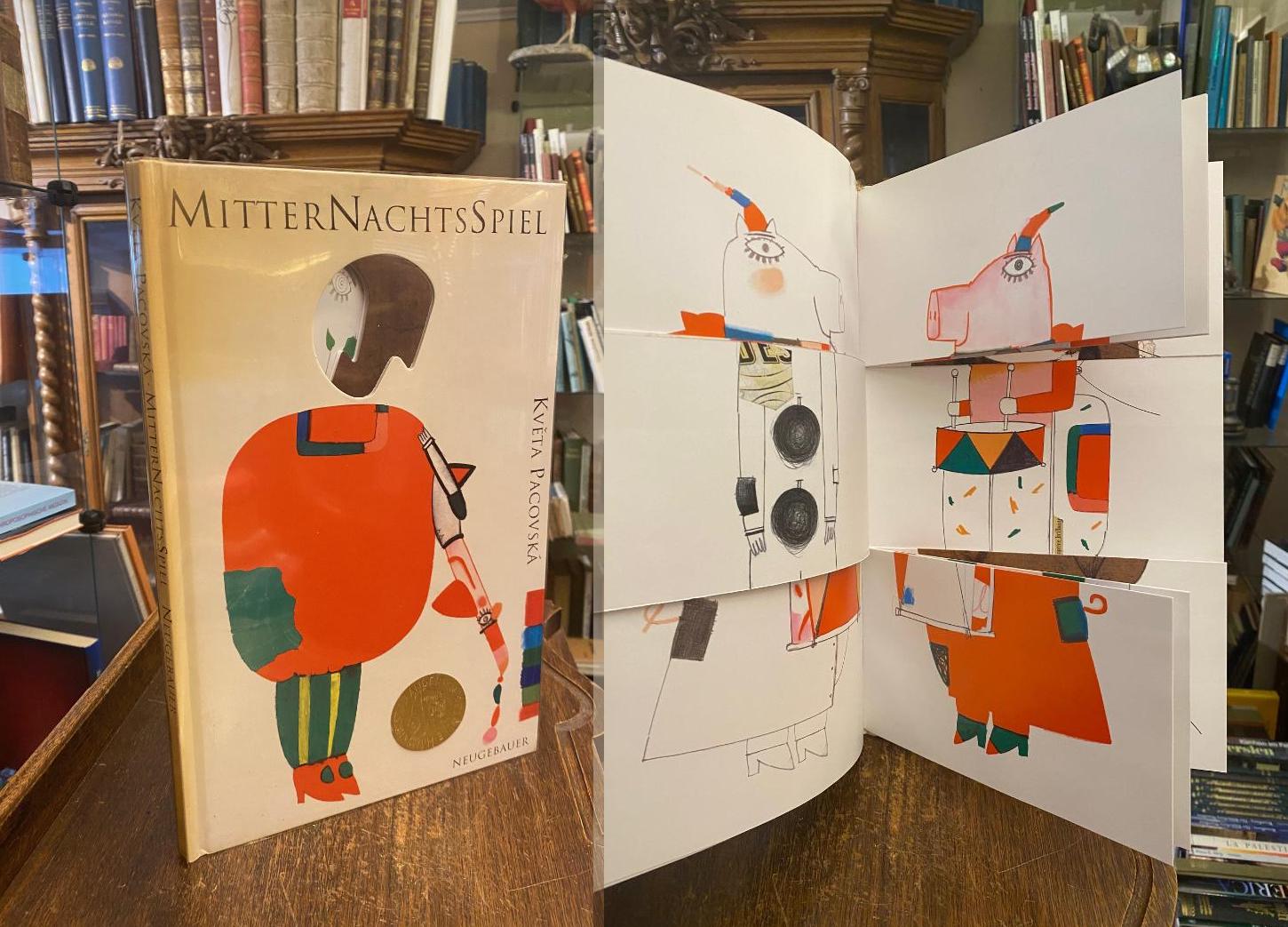 Pacovska, Kveta: Mitternachtsspiel. (Textfassung von Peter Baumann). (1. Aufl.), Gossau Zürich; Frankfurt; Salzburg, Michael Neugebauer Verlag, 1992. 4° (34x22), [39] S. in 5 farb Kunstdruck, Spielbilderbuch mit Ausstanzungen, Kordellesezeichen, geteilten Blättern zur Figurengestaltung, ill OPbd mit Ausstanzungen mit transparentem Umschlag (dieser mit Aufkleber ‚Hans Christian Andersen Medaille‘), der transparente Umschlag lichtverfärbt, sonst wohlerhalten und frisch, Ausgezeichnet mit der Hans-Christian-Andersen Medaille 1992.–