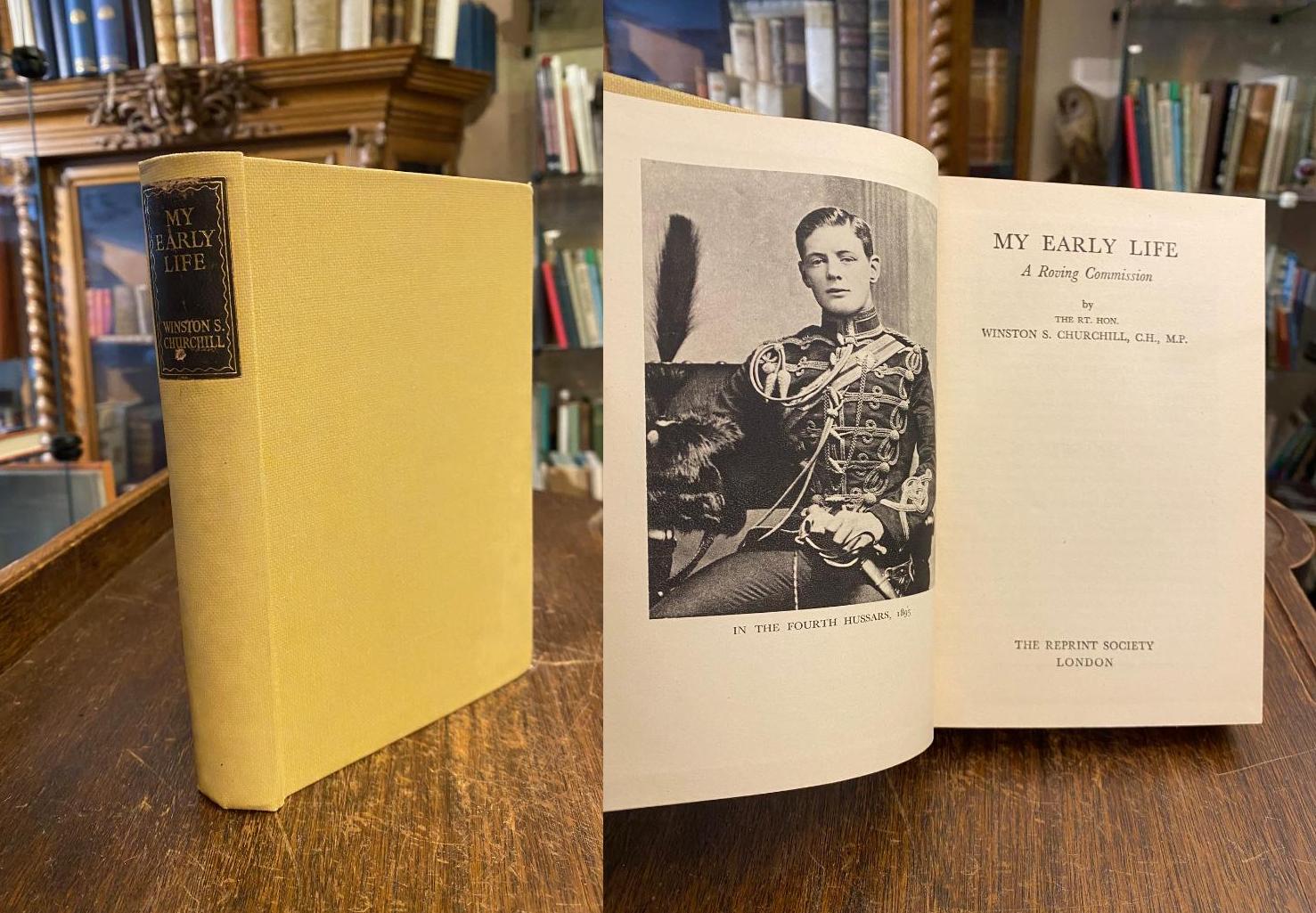 Churchill, Winston S. (1874-1965): My Early Life : A Roving Commission. London, The Reprint Society by Arrangement with MacMillan, 1944. 8° (19x13), 392 p., with 22 photo platesa and maps, publisher’s hardbound, jecket missing, name on endpaper, tight and clean, well cared,
