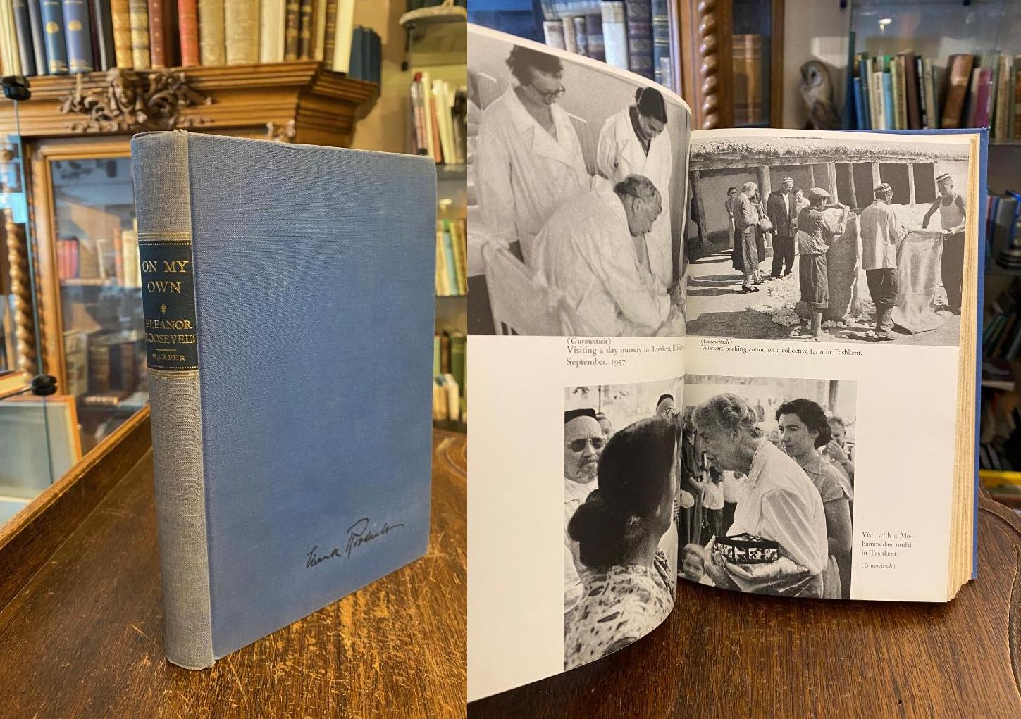 Roosevelt, Eleanor: On My Own. 1. ed., New York, Harper & Brothers Publishers, (1958). 4° (25x16), xii, 241 p., with 23 photo pictures on plates, publisher’s hardbound blue cloth, jacket missing, else tight and clean, well cared,