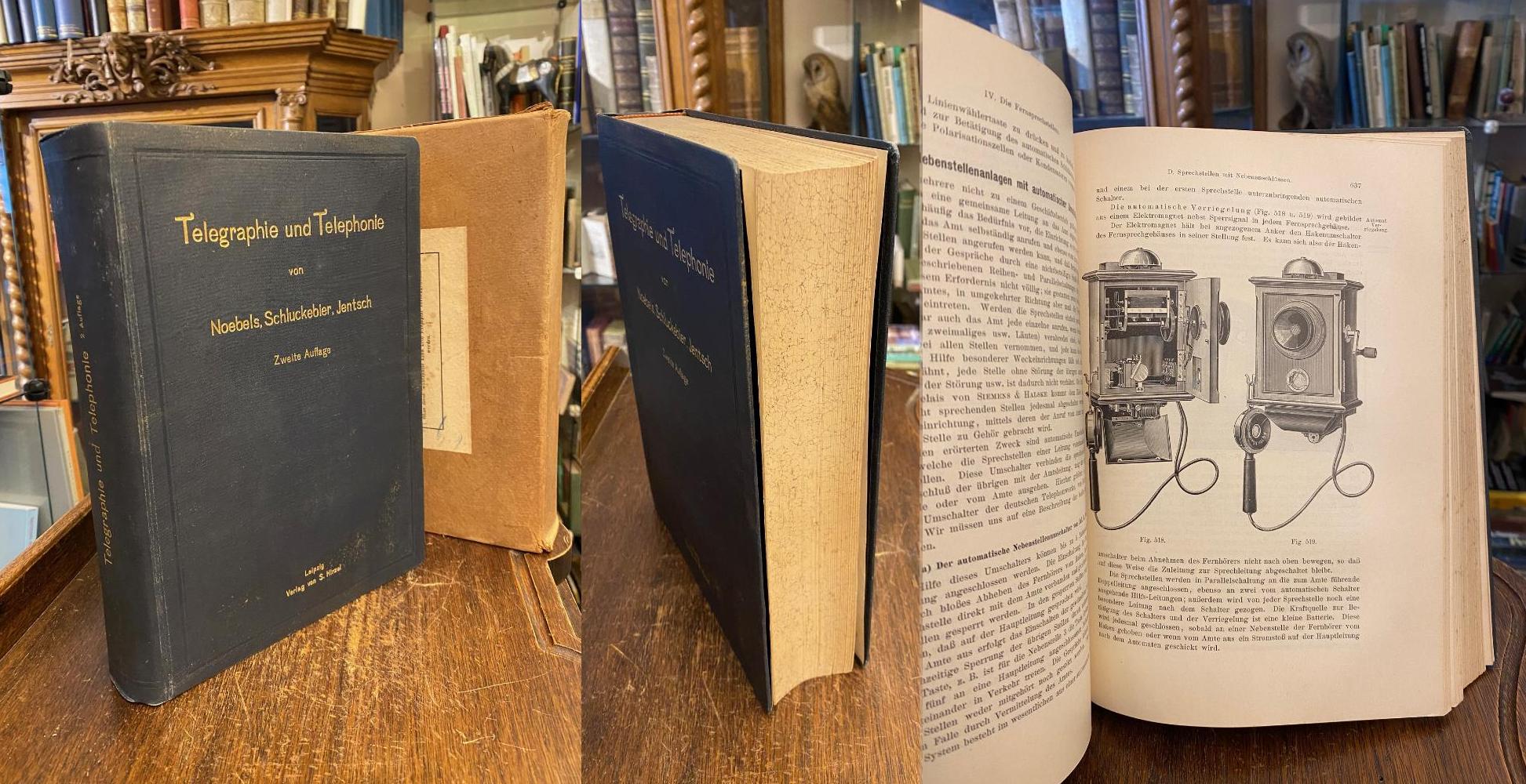 Heinke, Curt (Hrsg) /Noebels, Josef / Schluckebier, Albert / Jentsch, Otto: Handbuch der Elektrotechnik : Band XII: Telegraphie und Telefonie. 2. Aufl., Leipzig, Verlag von S. Hirzel, 1907. 4° (28x20), XXIV, 896 S., mit 762 Abb., dunkelblauer Oln (Kaliko) mit goldPrägung im Pappschuber, Papier im Fußschnitt teils leicht gewellt, kaum gelesen, sauber und wohlerhalten, Schuber gealtert, [= Handbuch der Elektrotechnik; XII : herausgegeben von Curt Heinke],