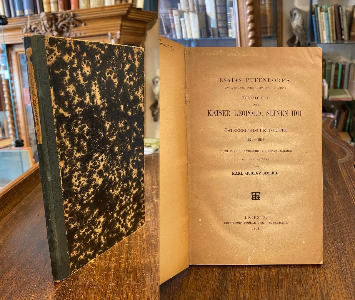 Leopold I HRR (1640-1705). – Pufendorf, Esaias (1628-1689). – Helbig, Karl Gustav (Hrsg): Esaias Pufendorf’s, Kngl. Schwedischer Gesandter in Wien, Bericht über Kaiser Leopold, seinen Hof und die österreichische Politik 1671 – 1674. Nach einer Handschrift herausgegeben und erläutert von Karl Gustav Helbig. (1. Aufl.), Leipzig, Verlag von B.G. Teubner, 1862. 8° (22x14), 99 S., HartBrosch d.Zt. mit handschriftl Rückentitel, obere Ecke etwas gestaucht, alter Name auf Innenspiegel, Titelblatt gebräunt, fest und sauber,