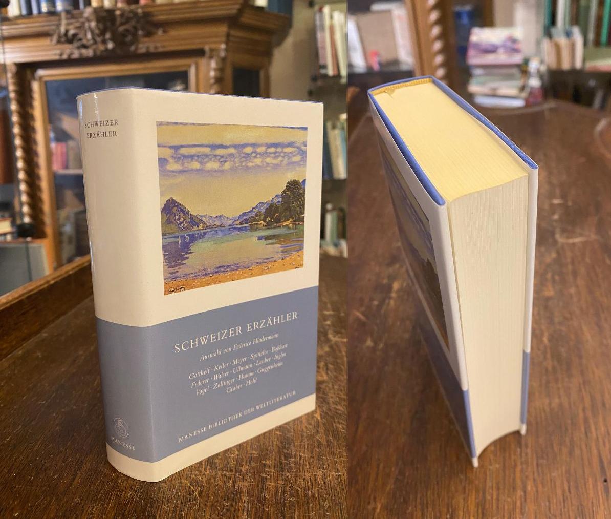 Hindermann, Federico (Ausw): Schweizer Erzähler. Mit einem Nachwort von Karl Fehr. 4. Aufl., Zürich, Manesse Verlag, (1985) Folgeauflage 1997. kl8° (15x10), 638 S., 1 Bl., blauer Oln mit goldRückentitel mit ill OU, Lesebändchen, Rücken minimal aufgehellt, nahezu ungelesen, schönes gepflegtes Exemplar, [= Manesse Bibliothek der Weltliteratur], enthält: Gotthelf, Jeremias: Elsi, die seltsame Magd.– Keller, Gottfried: Romeo und Julia auf dem Dorfe.– Meyer, Conrad Ferdinand: Das Leiden eines Knaben.– Spitteler, Carl: Das Bombardement von Abo.– Bosshart, Jakob: Altwinkel.– Federer, Heinrich: Das letzte Stündlein des Papstes Innocenz des Dritten.– Walser, Robert: Kleist in Thun.– Ullmann, Regina: Der ehrliche Dieb.– Lauber, Cecile: Das schreckliche Kalb.– Inglin, Meinrad: Die Furggel.– Vogel, Traugott, Der Erbteil.– Zollinger, Albin: Die Russenpferde.– Humm, Rudolf Jakob: Das Schneckenhaus.– Guggenheim, Kurt: Nachher.– Graber, Rudolf: Die Geschichte von der Schülerversicherung.– Hohl, Ludwig: Drei alte Weiber in einem Bergdorf.–