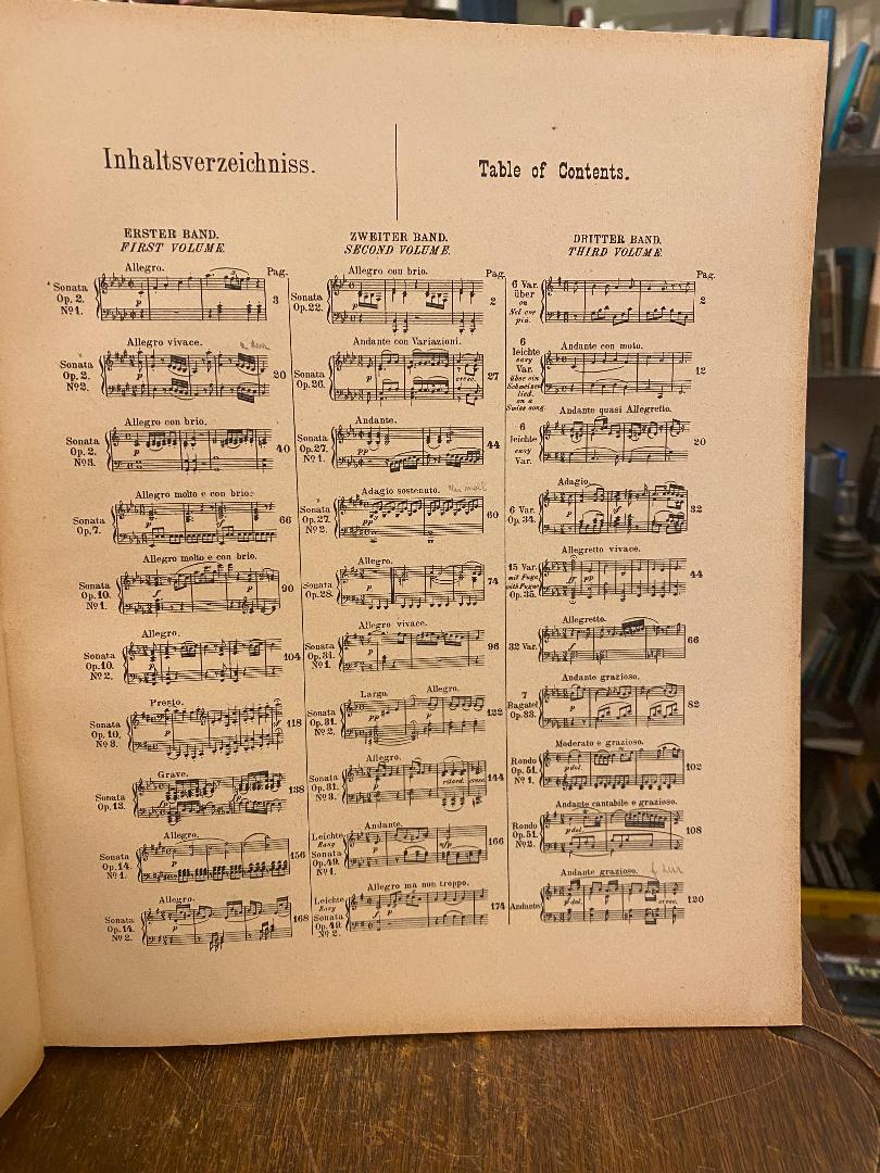 Beethoven, Ludwig van (1770-1824). – Lebert, Sigmund / Faisst, Immanuel von: Sonaten und andere Werke für das Pianoforte von Ludwig van Beethoven [in drei Bänden (von5)]: BAND I: 10 Sonaten (Op. 2-14).– BAND II: 10 Sonaten (Op. 22-49).– BAND 3: Op. 33-51 und ohne Opuszahl, Variationen, Rlondos, Bagatellen, Andante F dur. Bände 1-3 (von 5), Stuttgart und Berlin, J.G. Cotta’sche Buchhandlung Nachf, (VN 32 / 33 / 34) o. J. 4° (34x27), XXII,19,21,27,25,15,15,21,19,13,19; (IV),25,149,17,15,23,27,23,23,9,9; (IV),127 S., senffarb flex Oln mit TitelPrägung, minimal staubrandig, nahezu ungenutzt, schöne gepflegte Exemplare, [= Edition Cotta / Cotta Edition; 10-11-12 / Instruktive Ausgabe klassischer Klavierwerke : Abteilung III, Band 1-3 : unter Mitwirkung von Hans von Bülow, Immanuel von Faisst, Ignaz Lachner, Franz von Liszt, begründet von Sigmund Lebert], Parallelausgabe deutsch-englisch.–
