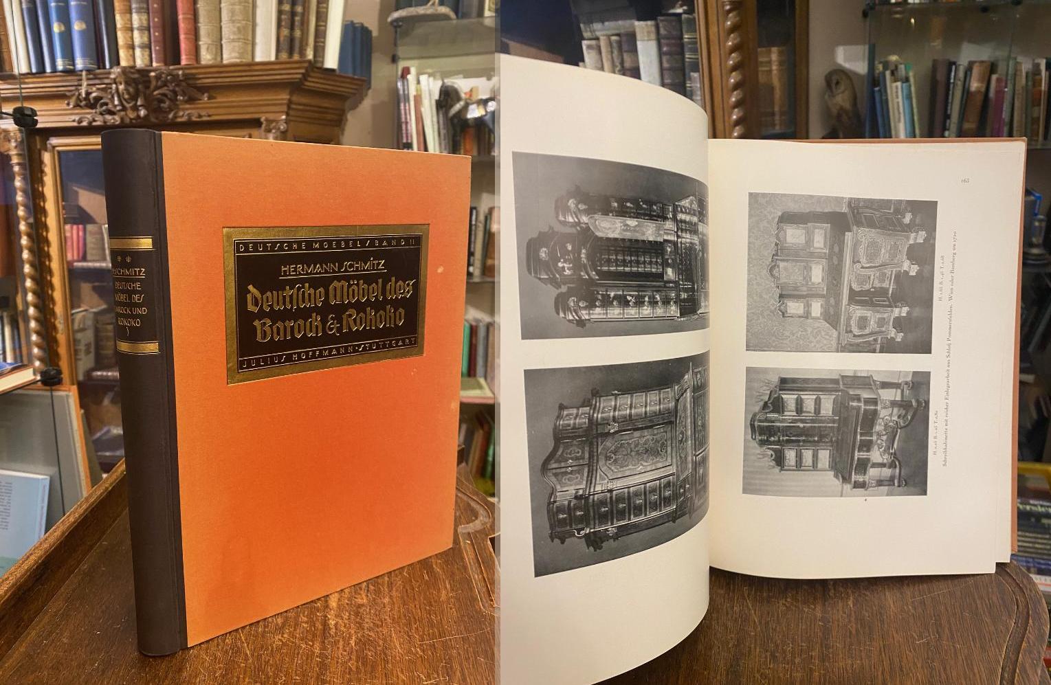 Schmitz, Hermann (Hrsg): Deutsche Möbel des Barock und Rokoko. Stuttgart, Verlag von Julius Hofmann, 1925. 4° (30x24), LVI, 311 S., mit 600 Abb., OHln mit goldPrägung, Einband etwas lichtrandig, Schnitt gering angestaubt, kaum gelesen, gutes Exemplar, [= Bauformen-Bibliothek; XVIII / Deutsche Möbel vom Mittelalter bis zum Anfang des 19. Jahrhunderts [in drei Bänden]; Band 2 : herausgegeben von Otto vo Falke und Hermann Schmitz]