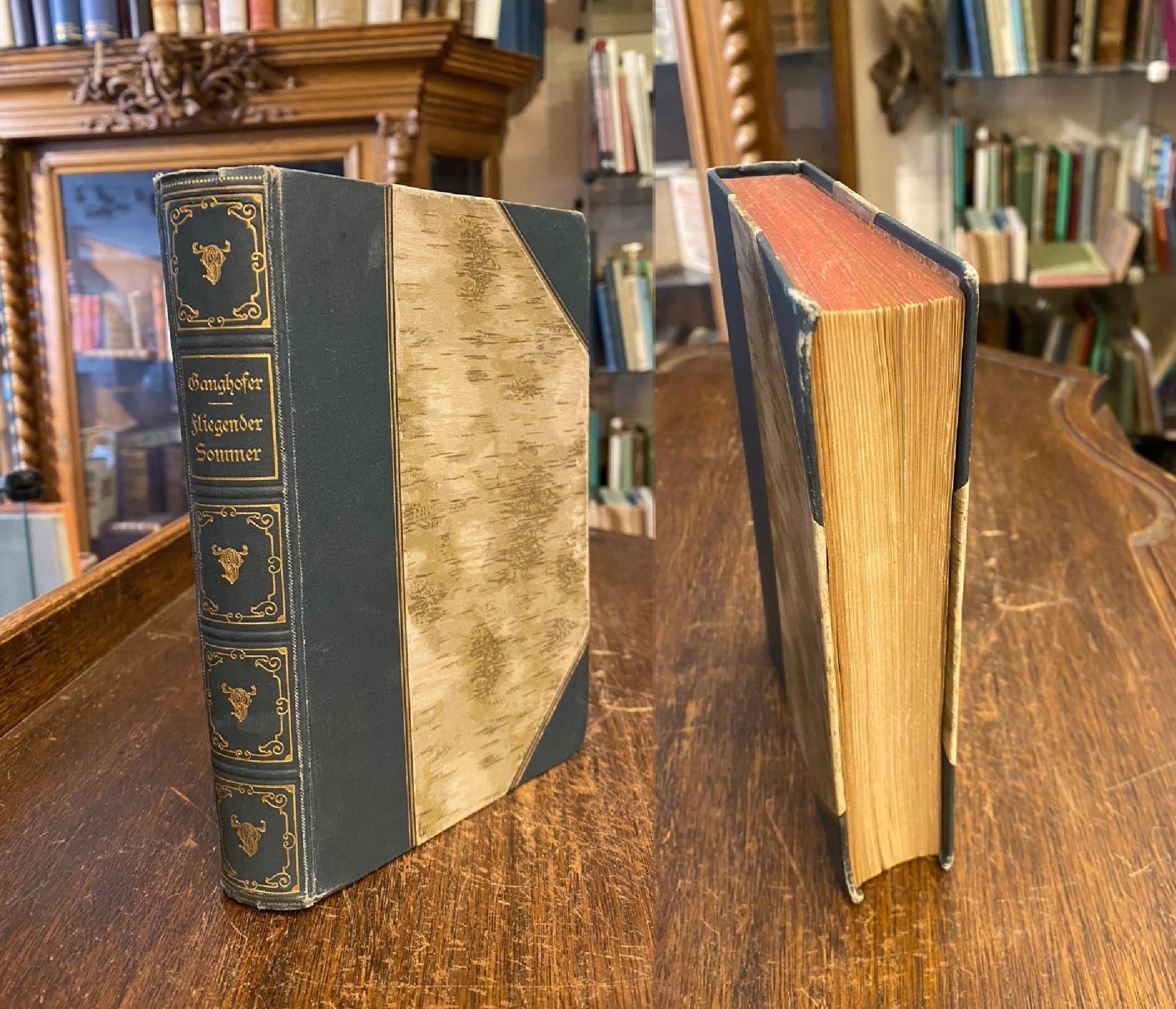 Ganghofer, Ludwig: Fliegender Sommer. (1. Aufl.), Berlin, Verlag des Vereins der Bücherfreunde, 1892. 8° (18x13), 6 Bl., 404 S., OHln mit reicher goldRückenPrägung, SchmuckVorsätze, kleiner Namenseintrag, geringe Lesespuren, fest und sauber, [= Veröffentlichungen des Vereins der Bücherfreunde; Jg. 1 Band 6], vorgebunden Preisausschreiben des Vereins für den besten Roman.–