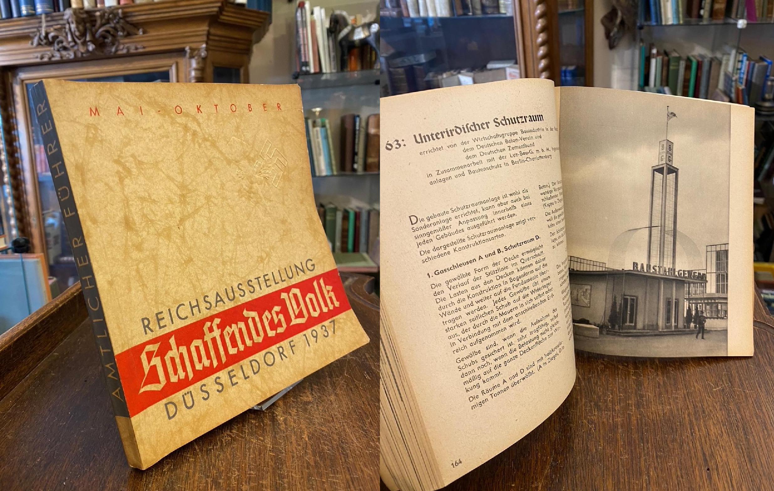 Heinson, Ernst (Red): Reichsausstellung ‚Schaffendes Volk‘ : Düsseldorf Mai bis Oktober 1937 : (Amtlicher Führer). 71.-110. Tsd., Düsseldorf, L. Schwan (Druck), 1937. 8° (21x20), 4 Bl., 224 S., mit Porträttafeln Hitler und Göring, sowie zahlr. fotograf Aufnahmen, graph. Darst., 1 eingefalteter farb Plan, OKart (Brosch) mit Titeldruck und blindgeprägte Rune, etwas gebräunt, rückseitig minimal verletzt, sauber und wohlerhalten, Hinweis auf §86a StGB: Abgabe nur zu Zwecken der staatsbürgerlichen Aufklärung, der Abwehr verfassungsfeindlicher Bestrebungen, der wissenschaftlichen und kunsthistorischen Forschung, der Aufklärung oder Berichterstattung über die Vorgänge des Zeitgeschehens oder der militärhistorischen und uniformkundlichen Forschung. Der Käufer bestätigt mit seiner Bestellung ebenfalls, Bücher mit Emblemen des Dritten Reiches nicht zu propagandistischen Zwecken zu verwenden. —