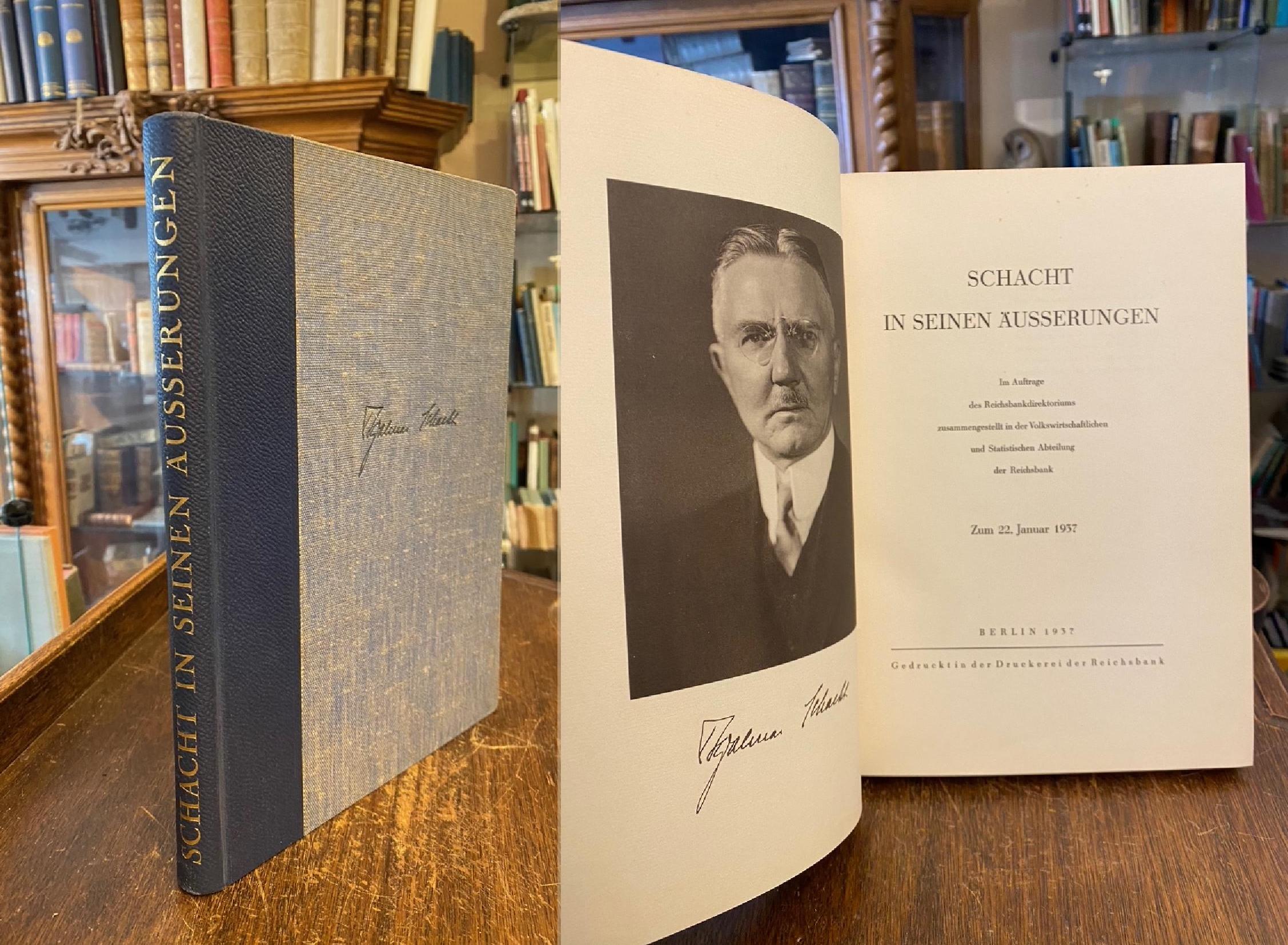 Schacht, Hjalmar (1877-1970). – Schacht in seinen Äusserungen – Zum 22. Janur 1937 : Im Auftrage des Reichsbandirektoriums zusammengestellt in der Volkswirtschaftlichen und Statistischen Abteilung der Reichsbank. Berlin, Gedruckt in der Druckerei der Reichsbank, 1937. 4° (28x20), 174 S., mit Porträtfrontispiz, blauer OHldr mit goldRückentitel, Kopfschnitt angestaubt, wohlerhalten und frisch, Hjalmar Schacht (1877-1970) Politiker, Bankier, 1923-1930 sowie 1933-1939 Reichsbankpräsident und von 1934-1937 Reichswirtschaftsminister.– Schacht gehörte zu den 24 im Nürnberger Prozess gegen die Hauptkriegsverbrecher vor dem Internationalen Militärgerichtshof angeklagten Führungspersonen der Zeit des Nationalsozialismus und wurde am 1. Oktober 1946 in allen Anklagepunkten freigesprochen.–