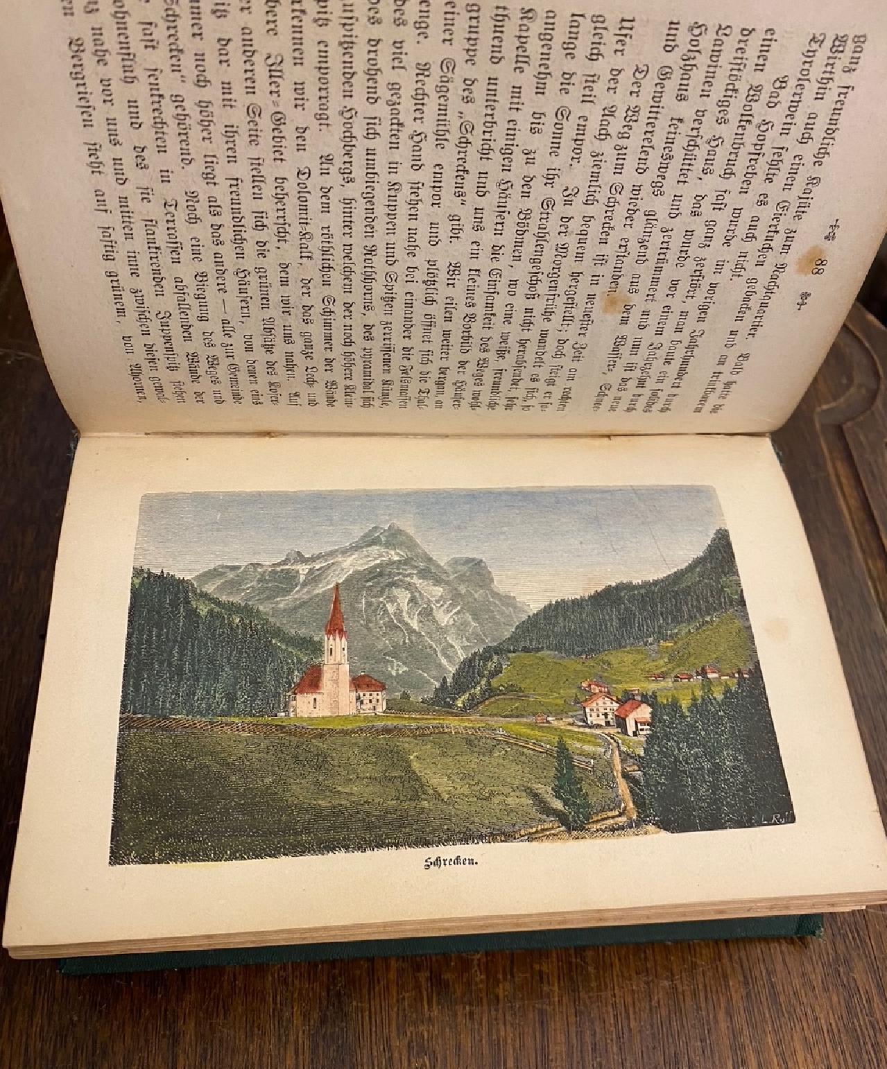 Grube, [August Wilhelm]: Vom Bodensee, früheren Rheinthalgletscher und aus dem Bregenzer Walde : Skizzen von A. W. Grube. Mit 13 Illustrationen. Stuttgart und Leipzig, Verlag von Hofmann & Hohl, 1875. 8° (18x12), (VI), 112 S., mit 5 (davon 4 kolorierte) Textillustrationen und 8 kolorierte Tafeln in Holzstich, grüner Oln gewachst mit Relief-Filetten, goldTitel, gering berieben, Titelblatt stockfleckig, sonst nur vereinzelte Stockflecken, gutes Exemplar, (Grube, Vom Bodensee, früheren Rheintalgletscher und aus dem Bregenzer Wald).–