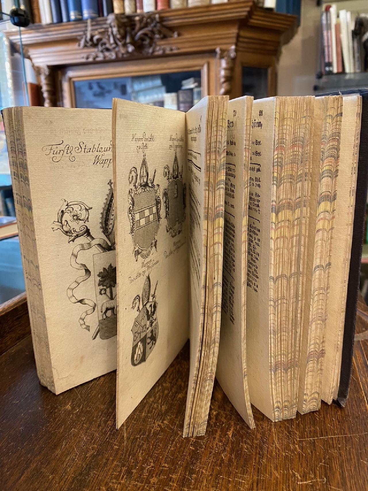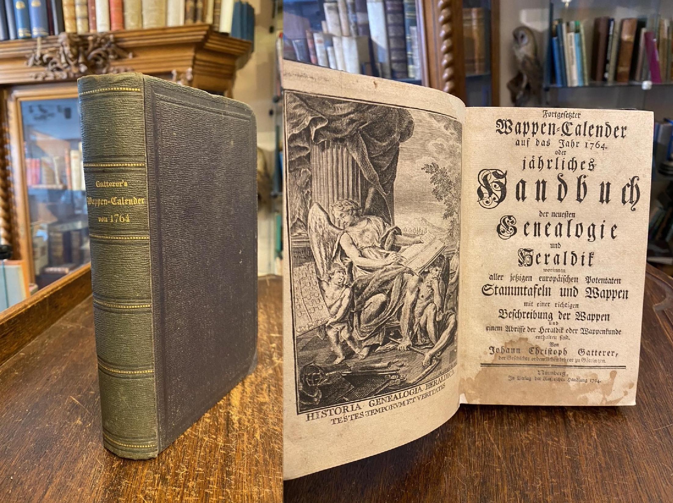 Gatterer, Johann Christoph: Fortgesetzter Wappenkalender auf das Jahr 1764 oder jährliches Handbuch der neuesten Genealogie und Heraldik, worinnen aller jetzigen Potentaten Stammtafeln und Wappen mit einer richtigen Beschreibung der Wappen und einem Abrisse der Heraldik oder Wappenkunde enthalten sind. Von Johann Christoph Gatterer, der Geschichte ordentlichen Lehrer zu Göttingen. Nürnberg, In Verlag der Raspischen Handlung / [Raspe], 1764. 8° (20x13), [10] Bl. (Vorwort/Kalendarium), 136 Bl. (Wappenteil), S. 133-207 (alphabetische Wappenbeschreibung), [3] S. (Register), 6 Bl. (Verlagsverzeichnis), mit meist ganzeitigen Wappen, gegenüber Stammtafeln, 2 eingefaltete Tafeln (Wappenlehre), Leineneinband des 19. Jahrhunderts mit goldRückentitel, marmorSchnitt, Fußecken etwas gestaucht, alter Name auf Innenspiegel, Titelblatt fußseitig mit größerem Fleck, sehr ordentliches sauberes Exemplar, kaum genutzt, [VD18 9028982X].–