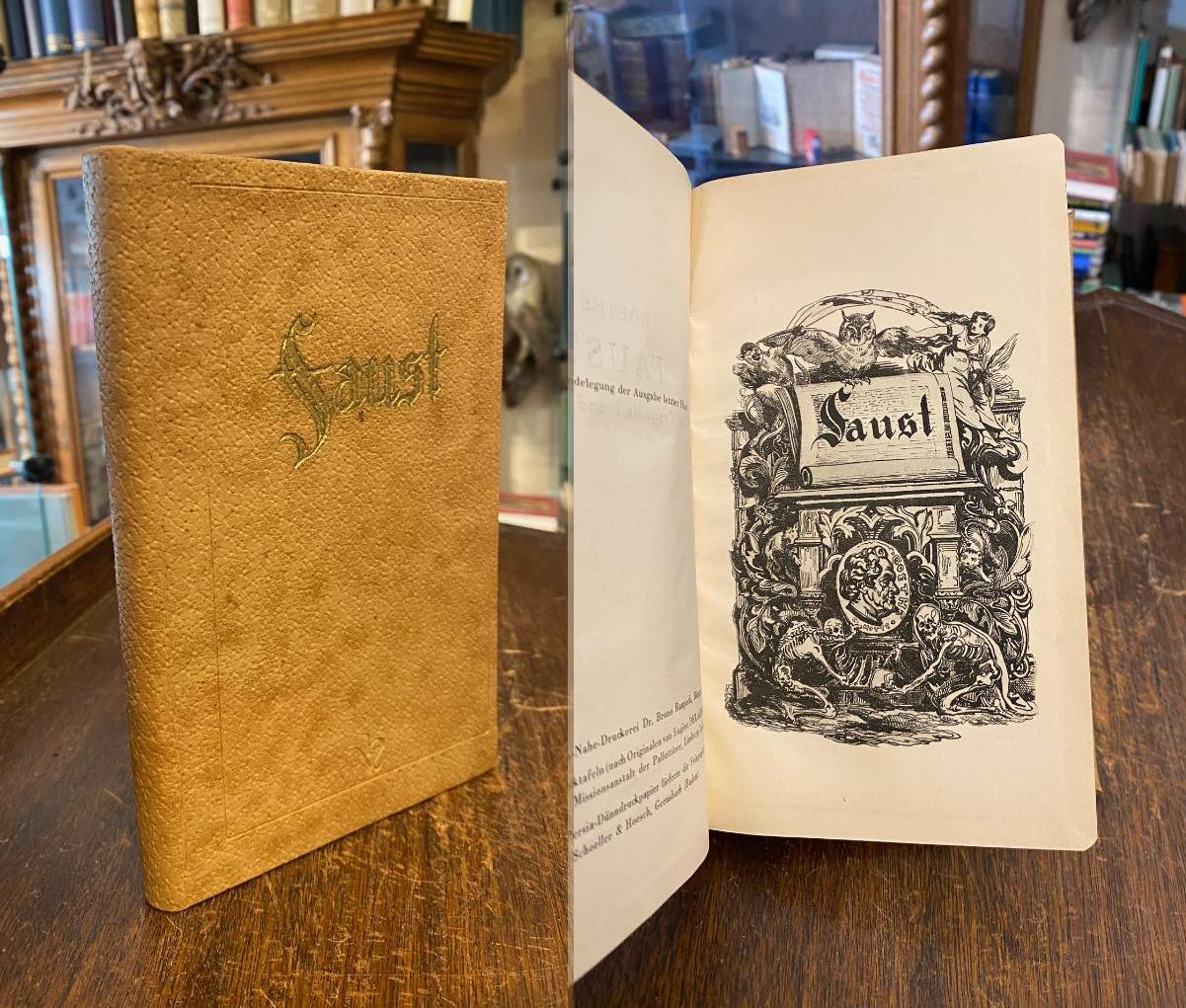 Goethe, (Johann Wolfgang von): Faust : Der Tragödie I. und II. Teil : (Unter Zugrundelegung der Ausgabe letzter Hand). Mit Tiefdrucktafeln nach Originanlen von Eugene Delacroix. Sonderausgabe, Frankfurt/M, Im A. O. Hellbrück Verlag, [1950]. 8° (20x13), 312 S., Persia-Dünndruckpapier, mit 16 Tafeln, OLdr mit goldDeckeltitel, Schnitt/Vorsätze gering angestaubt, gutes Exemplar, [Henning, Faust-Bibliographie 356]