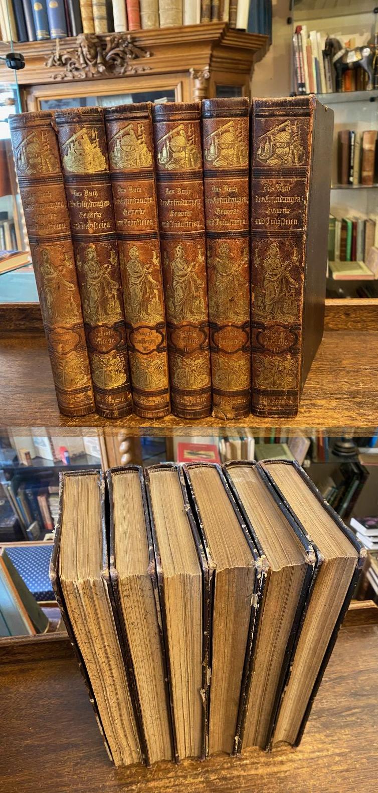 Das neue Buch der Erfindungen, Gewerbe und Industrien : Rundschau auf allen Gebieten der gewerblichen Arbeit [in sechs Bänden] – Prachtausgabe. 7., umgearbeitete und verbesserte Aufl., 6 Bände in 6 (so komplett), Leipzig und Berlin, Verlagsbuchhandlung von Otto Spamer, 1876-1879. 4° (26x17), VIII,544; X,550; VI,474; VIII,576; VIII,480; IX,589 S., mit zahlr. Textholzschnitten und Tafeln, OHldr mit dekorativer goldRückenprägung, marmorVorsätze, Ecken/Kanten etwas bestossen, etwas berieben, Name auf Titel, ein paar Altersspuren, aber durchaus sauber und solide, BAND 1: Einführung in die Geschichte der Erfindungen.– BAND 2: Die Kräfte der Natur und ihre Benutzung.– BANd 3: Die Gewinnung der Rohstoffe.– BAND 4: Die chemische Behandlung der Rohstoffe.– BAND 5: Die Chemie des täglichen Lebens.– BAND 6: Die mechanische Bearbeitung der Rohstoffe – Mit Gesamtregister.–