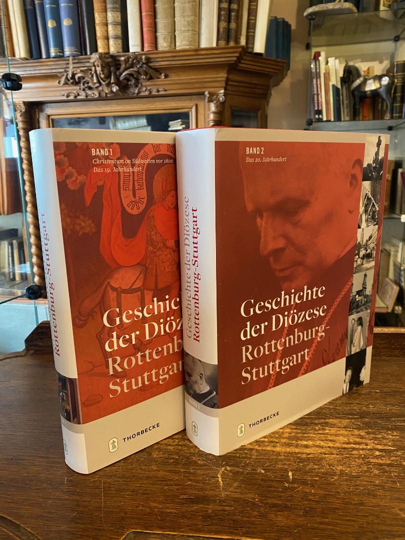 Holzem, Andreas / Zimmermann, Wolfgang (Hrsg): Geschichte der Diözese Rottenburg-Stuttgart [in zwei Bänden]: Band 1: Christentum im Südwesten vor 1800 – Das 19. Jahrhundert.– Band 2: Das 20. Jahrhundert. Herausgegeben im Auftrag des Geschichtsvereins der Diözese Rottenburg-Stuttgart. 2 Bände in 2 (so komplett), Ostfildern, Thorbecke, (2019). 4° (27x22), XV, 723; IX, 774 S., reich illustriert, 1 gefaltete Kartenbeilage, Oln mit Oln, Titelblattecke mit schwachem Eckknitter, sehr vereinzelt wenige dünne Bleistiftunterstreichungen, sehr ordentliche Exemplare,