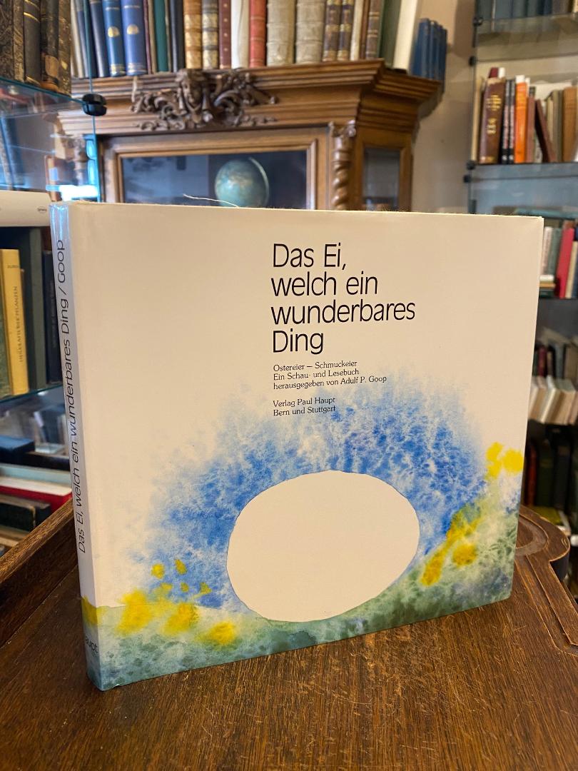 Goop, Adulf P. (Hrsg): Das Ei, welch ein wunderbares Ding : Ostereier – Schmuckeier : Ein Schau- und Lesebuch. [Publikation zur Ausstellung im Liechtensteinischen Landesmuseum, Vaduz, 3. März bis 2. April 1989). Illustrationen von Louis Jäger. Bern; Stuttgart, Verlag Paul Haupt, (1989). gr8°quer (23x24), 212 S., reich illustriert mit fotograf Aufnahmen, historischen Abb., Illustrationen, Oln mit ill OU, nahezu ungelesen, schönes gepflegtes Exemplar,
