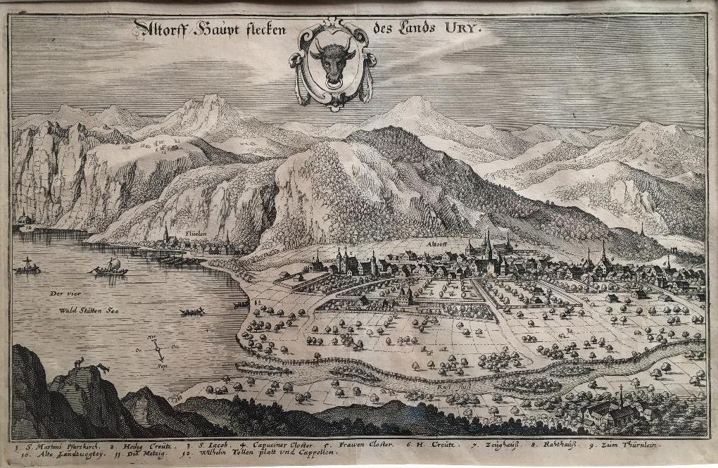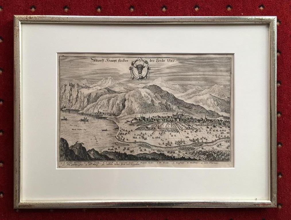CH – Altdorf. – Merian, Matthaeus: ‚Altorff / Hauptflecken des Lands Ury‘ Ansicht von Altdorf aus halber Vogelschau, links der Vierwaldstättersee (Urnersee) mit Flüelen, unten begrenzt durch die Reuss-Mündung, oben Kantonswappen, unten Legende 1-12.– Kupferstich aus Topographia Helvetiae, 1650. Bildformat 20x32 cm, Rahmen 35 x 48, unter Passepartout in Silberleiste, schönes Exemplar, *Fauser 258. –