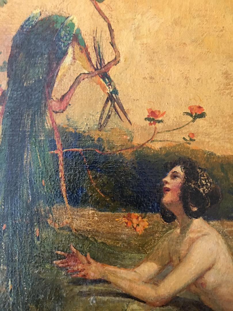 Koberstein, Hans (1864 Schulpforta – 1945 Berlin). – ‚Nymphe und Paradiesvogel‘ : Nackte Schöne in Bach-Landschaft erbittet unter einem Ast von einem Paradiesvogel einen Reif. Öl auf Leinwand, signiert und datiert unten rechts 1922 in zeitgenössischem florentinischem Holzrahmen. Berlin, 1922. Rahmenformat 57 x 47 cm, Bildformat 49 x 39 cm, schöner gepflegter Zustand, *Thieme/Becker XXI, 60f.– Akadmische Ausbildung in Dresden und Berlin bei Max Fr. Koch und Otto Lessing.– Mitglied der Berliner Künstlervereinigungen, schuf monumentale Figurenbilder, Allegorien und Ölbilder des historischen Genre sowie Märchen und Legenden.–