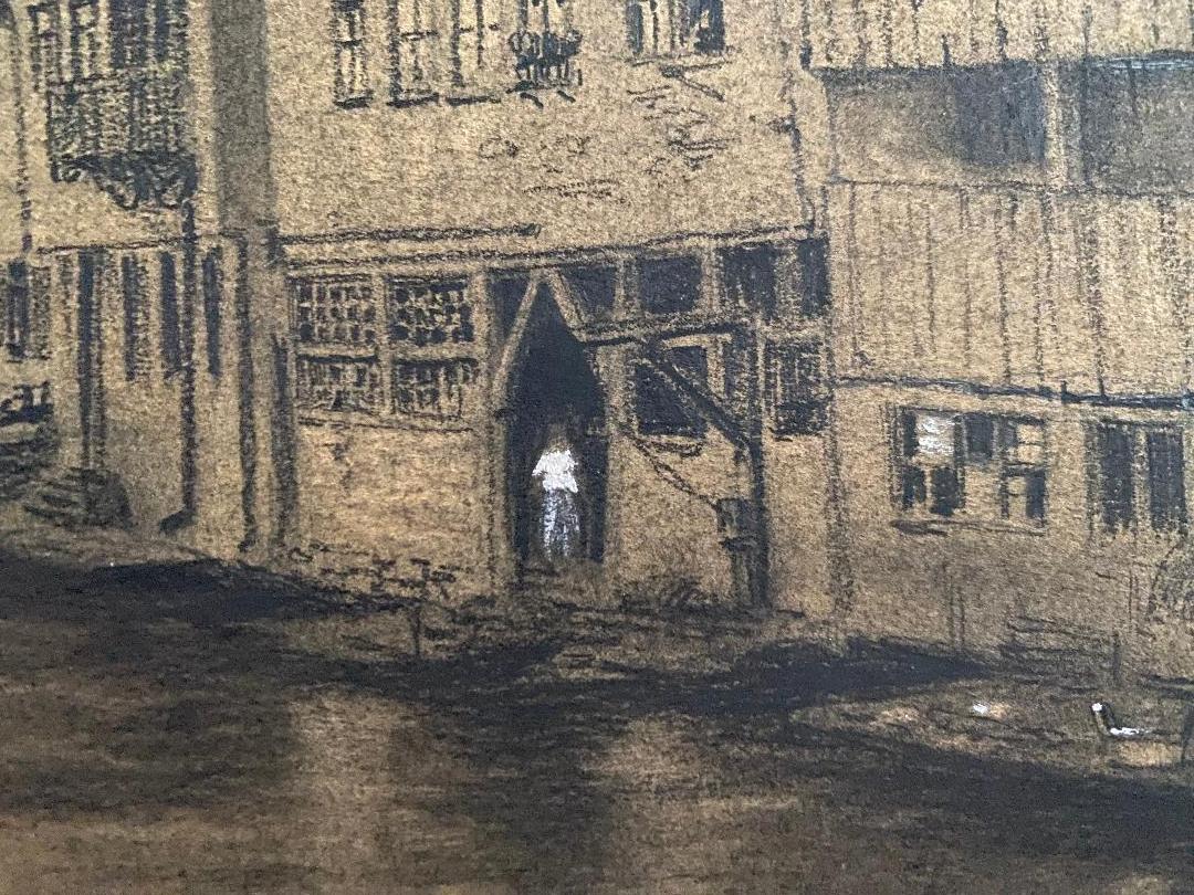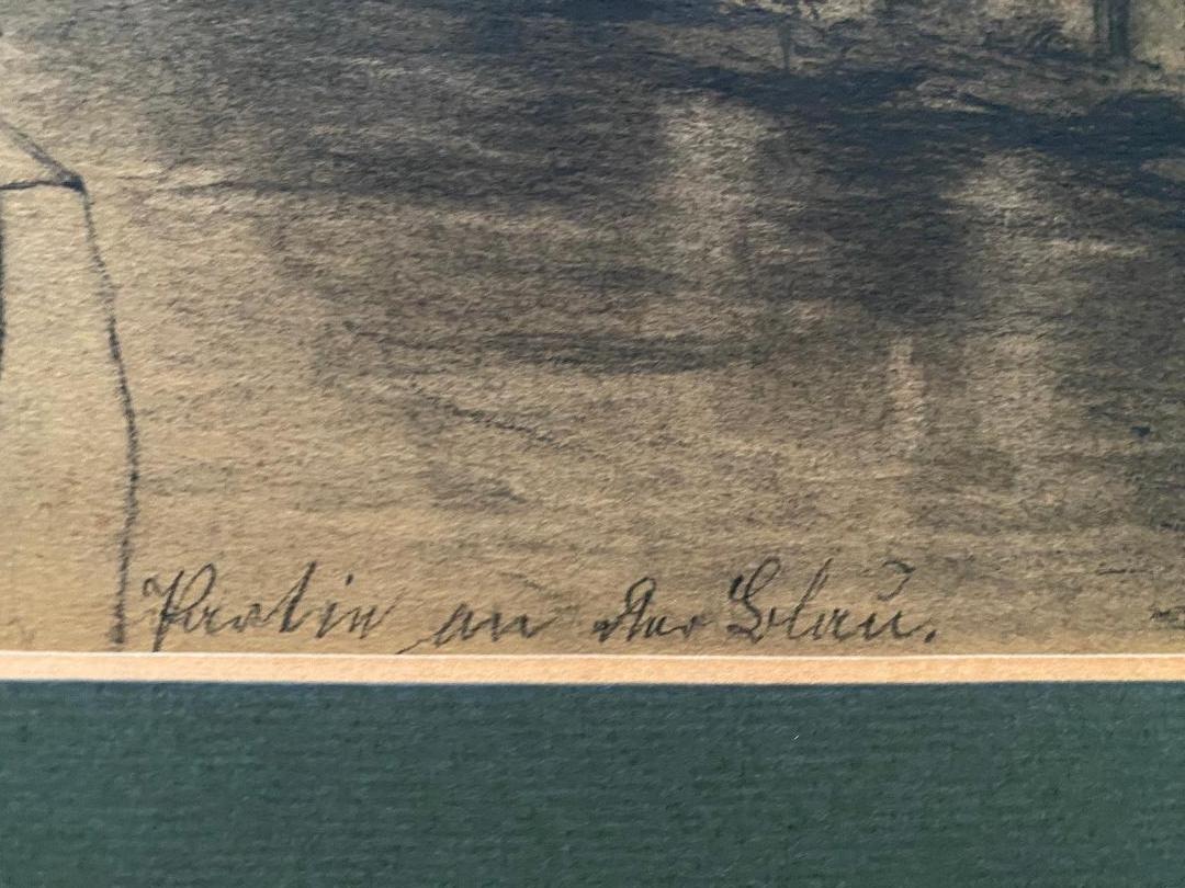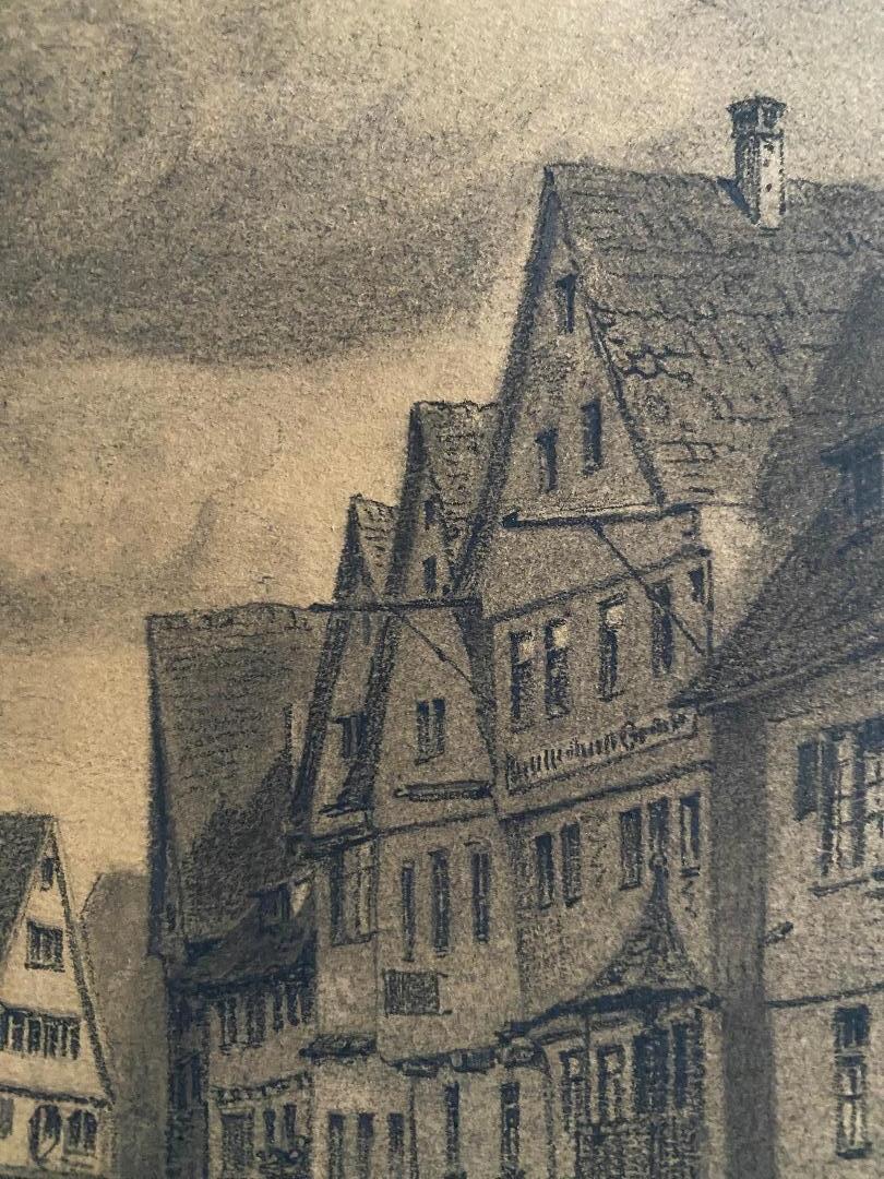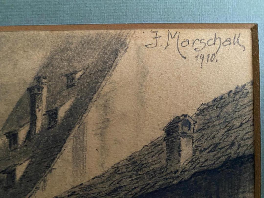 Ulm. – Marschall, Joseph (1887 – 1917). – ‚Ulm – Parie an der Blau‘ : idyllische Vedute der mittelalterlichen Stadt, Personen weiss gehöht : Original-Bleistiftzeichnung : oben rechts handsigniert und datiert 1910, unten bezeichnet, rückseitig Informationen : Ulm, 1910. Bildausschnitt 23 x 32 cm, unter Passepartout 32 x 40 cm, schöner Zustand,