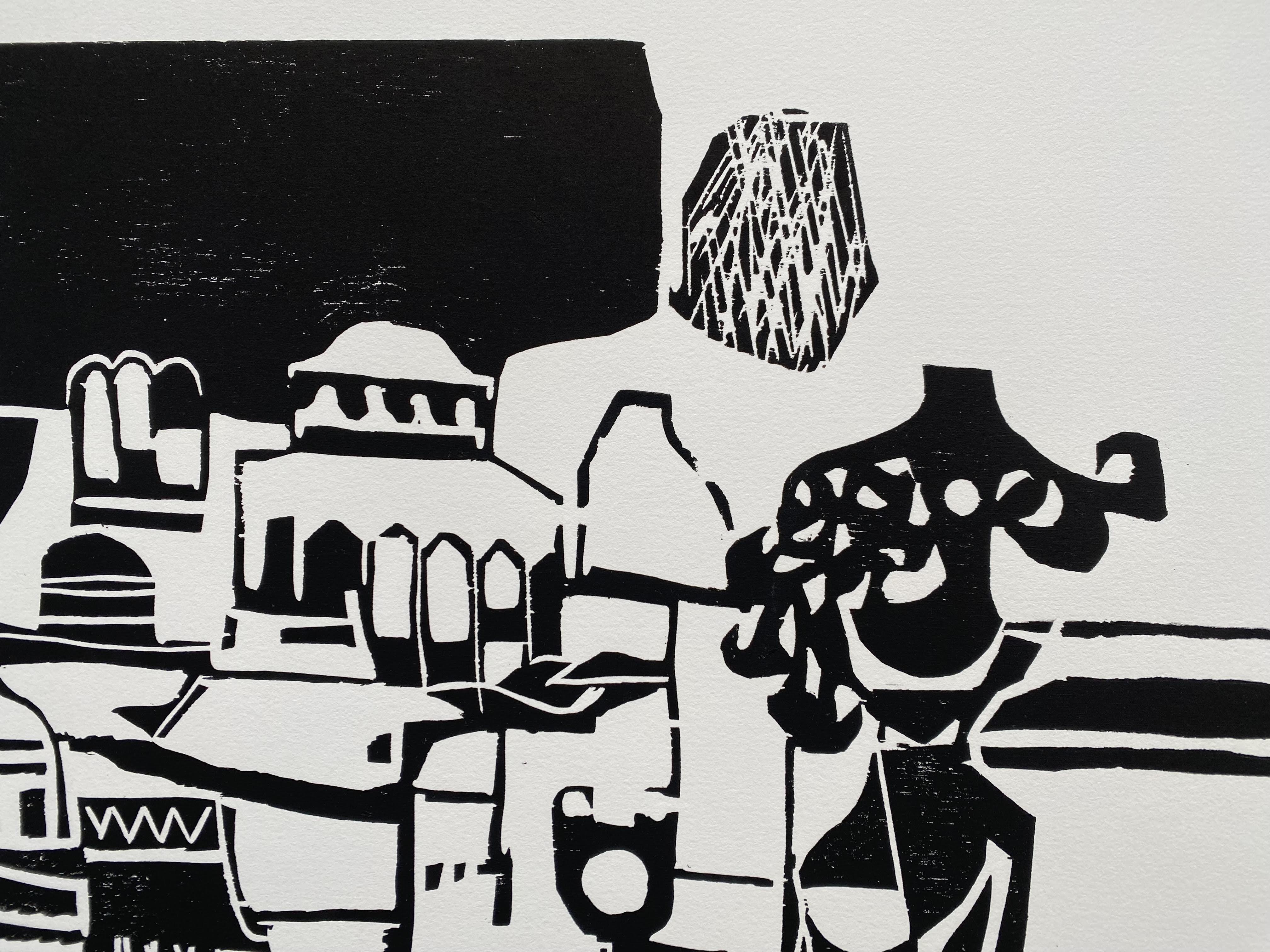 Ebell, Paul Heinrich (1908 Berlin – 1998 Bad Waldsee). – ‚Weisse Stadt‘ : großformatiger Holzschnitt auf BFK Rieves : Handdruck : mit Bleistift numeriert 4/30 und handsigniert. Bad Waldsee, um 1970. Blattformat 57 x 76 cm auf Karton säurefrei reversibel punkt-montiert, wohnfertig gerahmt in weiss lackierten Alurahmen 60 x 80 cm, tadelloses Blatt, * Nagel, Schwäbisches Künstlerlexikon; 35.– Wirth, Kunst im deutschen Südwesten von 1945 bis zur Gegenwart; auf Wunsch wohnfertig gerahmt in weiss lackierten Alurahmen 60 x 80 cm + 60,00