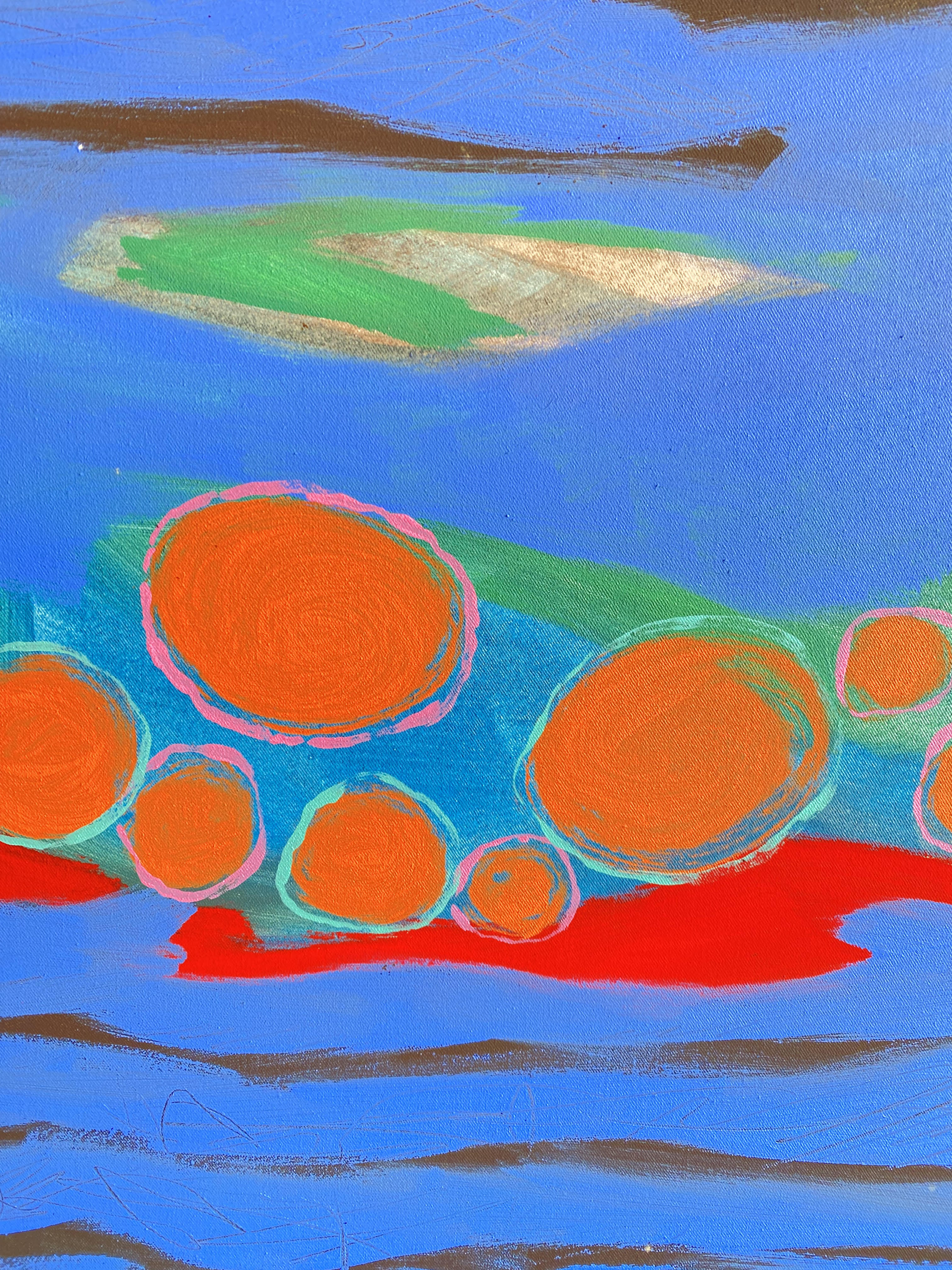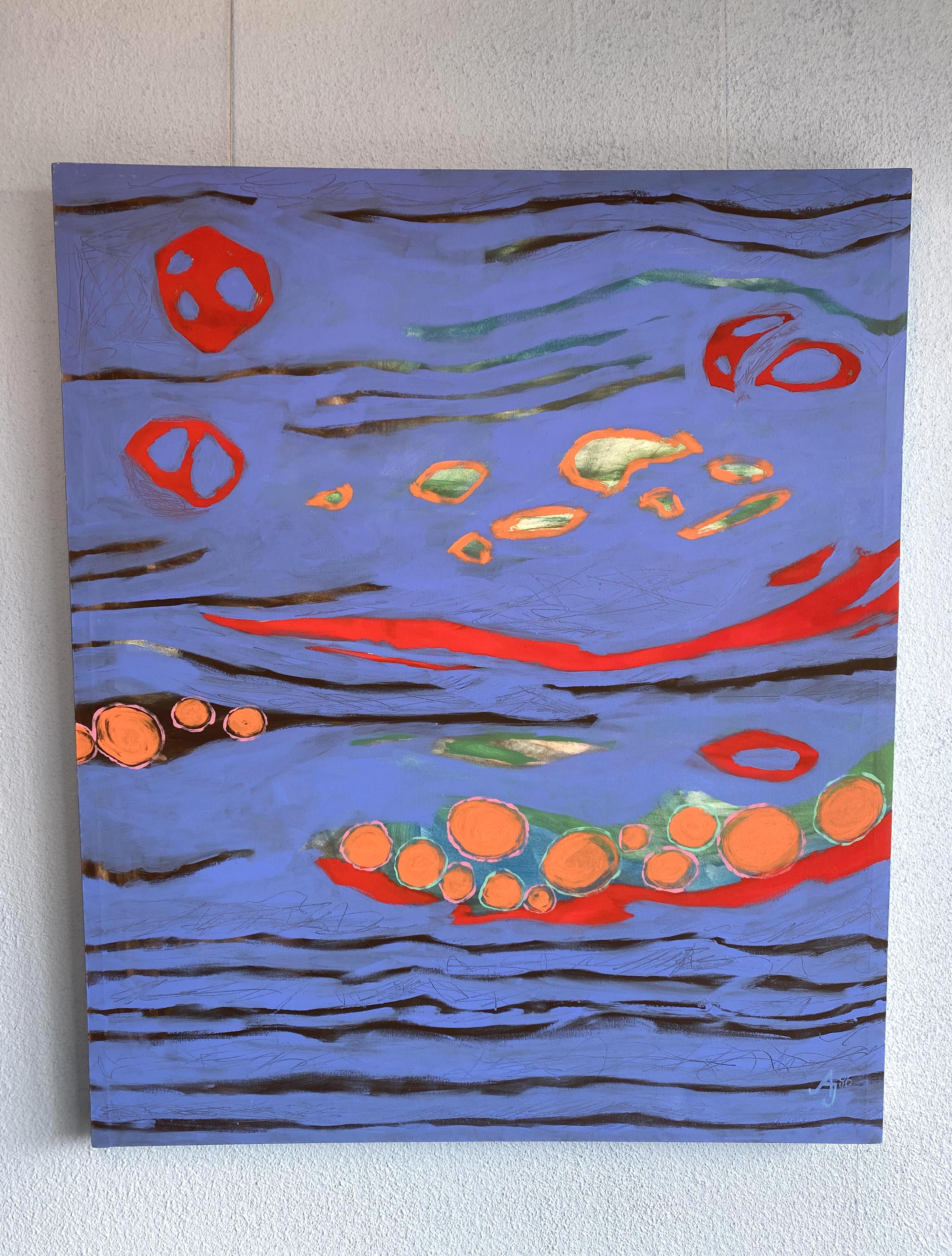 Janle, Annette (1960 Stuttgart – 2016 Tübingen): ‚fishing for compliment‘ : unten rechts signiert, datiert, rückseitig bezeichnet : Acryl auf Leinwand auf Holzrahmen gespannt : Tübingen, November 1996. 100 x 84 cm, 1980–1984 Studium Sozialpädagogik, 1994–1996 Kunstseminar Freie Hochschule Metzingen, Offener Studienbereich.– seit 1996 freischaffende Künstlerin.– seit 2002 freie Lehrtätigkeit.– 2014 Artist in Residence Hrisey/Island.– Mitglied im Verband Bildender Künstler Württemberg (VBKW) und im Künstlerbund Tübingen.– Atelier in Tübingen.– frühzeitiger Tod 2016.–