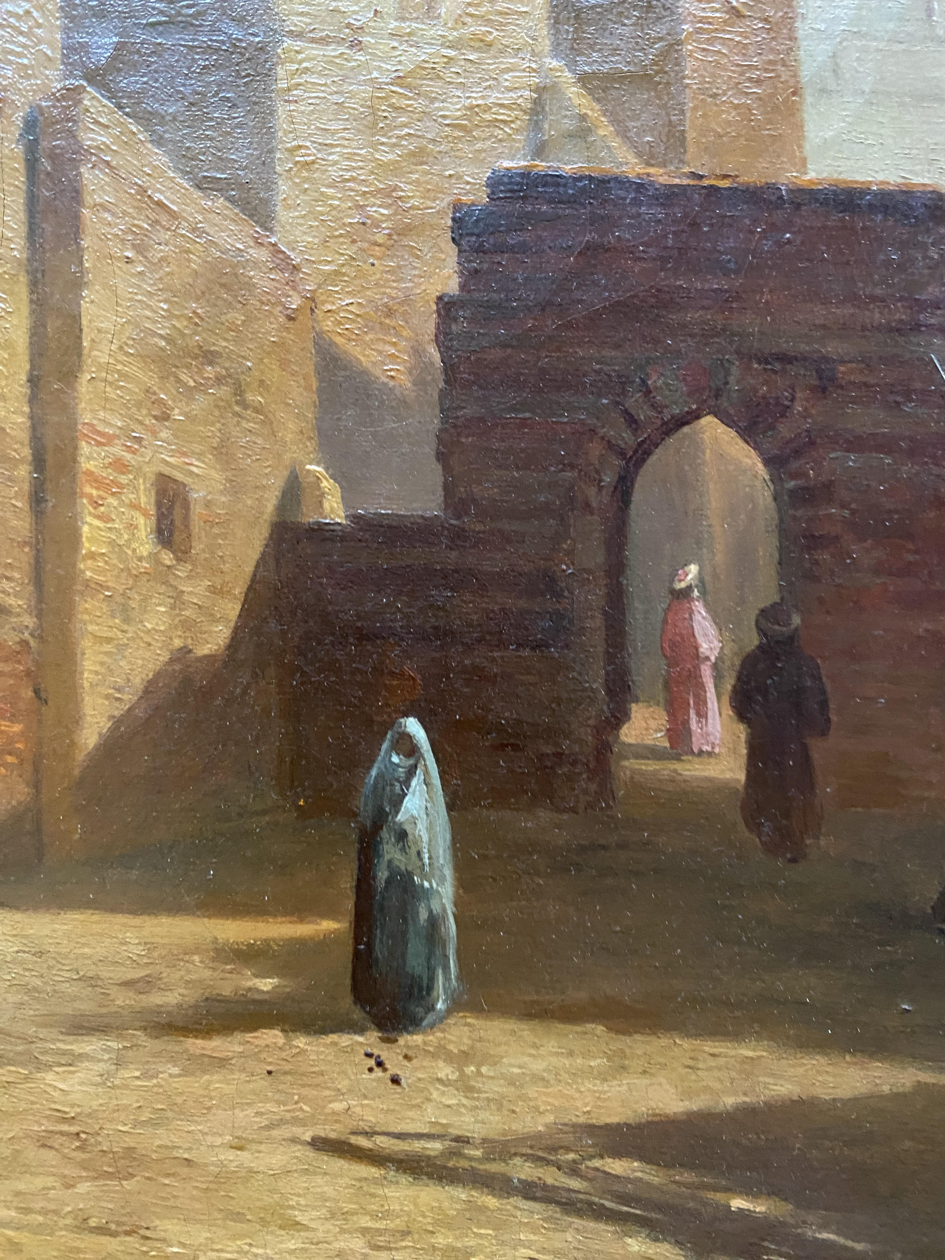 Geyer, Georg (1823 Wien – 1912 Wien): ‚Alte Moschee in Luxor‘ : stimmungsvolle Ansicht eines Platzes mit rastenden Beduinen und Händlern überragt von der Moschee, Palmen, Tempelruinen, orientalischer Lichteinfall : Gemälde auf Leinwand auf Keilrahmen, im Prunkrahmen, unten rechts signiert und datiert 1891 : rückseitig bezeichneter Klebezettel des Künstlers : Luxor, 1891. Bildmasse 42 x 32 cm, Rahmen 59 x 48 cm schöne gepflegte Erhaltung, *Thieme/Becker XIII, 508.– Wurzbach V (1859).– Bötticher I (1891).– österreichischer Landschafter.– Studium an der Wiener Akadmie bei Josef Mössmer, Franz Steinfeld und Thomas Ender.–
