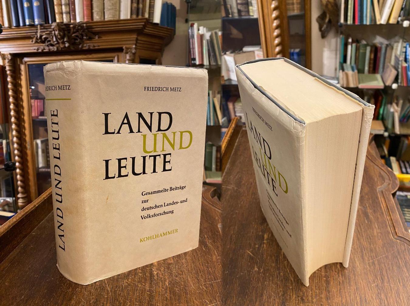 Metz, Friedrich: Land und Leute : Gesammelte Beiträge zur Landes- und Volksforschung. Stuttgart, W. Kohlhammer Verlag, 1961. gr8° (24x16), VII, 16, 1099 S., einige Tafeln, grauer Oln mit goldTitel mit OU, Umschlag kopfseitig angerändert, sehr vereinzelt dünnen Bleistiftunterstreichungen, gutes Exemplar, Aus Anlass des 70. Geburtstages von F. Metz im Auftrag von Freunden und Schülern zusammengestellt und herausgegeben von E. Meynen und R. Oehme.– Mit Gratulantenliste.–