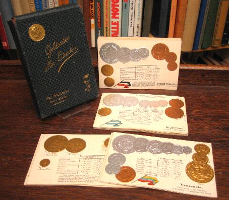 Geldsorten aller Länder. 45 Postkarten mit ReliefPrägung: Kompletter Münzsatz einer Nation in metallischer ReliefPrägung mit Nationalflagge und Umrechnungstabelle. Berlin-Schöneberg, Max Heimbrecht, [um 1910]. kl8° (Kartenformat 14x9), die Karten in dunkelgrünem geprägten PappEtui mit Goldprägung und Einstecklasche, Karten etwas angestaubt, die SchuberEcken leicht bestossen, wohlerhaltenes gepflegtes Exemplar, Satz Max-Heimbrecht-Münzpostkarten im Original-Etui in schöner Erhaltung.— Wie die Karten von Hugo Semmler (Magdeburg) sowie die von Walter Erhard (Waiblingen später Altensteig) sind die Münzkarten von Max Heimbrecht in dieser Vollständigkeit sehr selten.– enthält: Bulgarien.-Ungarn.– Oesterreich.– Serbien.– Transvaal.– Deutsch-Neuguinea.– Deutsch-Ostafrika.– Deutschland.– L’Uruguay.– Dänemark.– Schweiz.– Englische Kolonien (Straits Settlements) Hongkong.– Tunis.– La Grande Bretagne et l’Irlande.– Niederlande.– China (Privonzen: Kwang-Tung und Hu-Peh).– Frankreich.– Vereinigte Staaten von Amerika.– Argentinien.– Brasilien.– Ecuador.– Türkei I.– Türkei II.– Japan [I].– Japan II.– Aegypten.– Venezuela.– Portugal.– Chile.– Belgien.– Rumänien.– Russland.– Peru.– Nederlansch-Indie.– Griechenland.– Norwegen.– Schweden.– Italien.– Persien.– Siam.– Marokko.– Finnland.– Britisch-Ostindien / Ceylon.– Mexiko.– Spanien.–