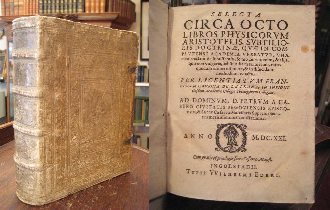 Aristoteles (384v-322v). – Murcia de la Llana, Francisco: Selecta Circa Octo Libros Physicorum Aristotelis, Subtilioris Doctrinae : Quae In Complutensi Academia Versatur, Una cum tractatu de subsistentia, & modis unionum, & aliis, quae non vulgaria, sed subtilia maxime sunt, miro quodam ordine disposita, & in dilucidam methodum redacta / Per Licentiatum Franciscum Murcia De La Llana, In Insigni eiusdem Academiae Collegio Theologorum Collegam. Ad Dominum, D. Petrum A Castro Civitatis Segoviensis Episcopum, & Sacrae Caesareae Maiestatis Supremi Senatus meritissimum Consiliarium. Ingolstadtii, Typis Wilhelmi Ederi, Anno M.DC.XXI. Ingolstadt, Wilhelm Eder, 1621. 8° (20x15), 8 Bl., 675 S., Schweinslederband d.Zt. auf 4 Bünden, reicher BlindPräg, Schließen fehlen, neuzeitliches Exlibris auf Vorsatz, ordentliches sauberes Exemplar, [VD17 12:631728W].– Zensor: Figueroa, Franciscus de.– Widmungsempfänger: Castro, Petrus a.–