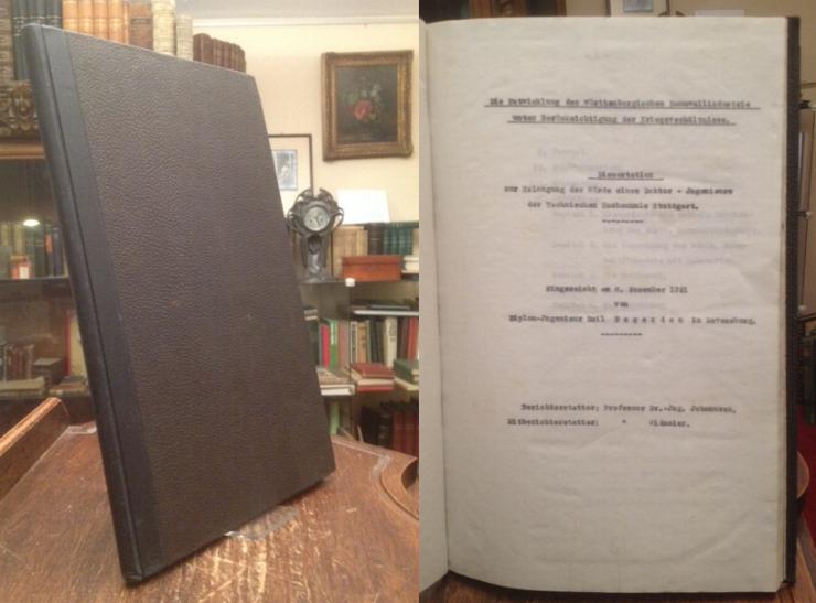 Degerdon, Emil (Ravensburg): Die Entwicklung der württembergischen Baumwollindustrie unter Berücksichtigung der Kriegsverhältnisse. Dissertation zur Erlangung der Würde eines Doktor-Ingenieurs der Technischen Hochschule Stuttgart. Typoskript, 1921. 4° (33x21), [2], 112 Bl., 1 Tafel mit 4 montierten Leinen-Mustern, Hln d.Zt., die Muster stockfleckig, sonst fest sauber und gepflegt, 1. Historische und soziale Entwicklung der württembergischen Baumwollindustrie.– 2. Die Versorgung der württ. Baumwollindustrie mit Rohstoffen.– 3. Die Spinnerei.– 4. Die Weberei.– 5. Die Veredlung.–