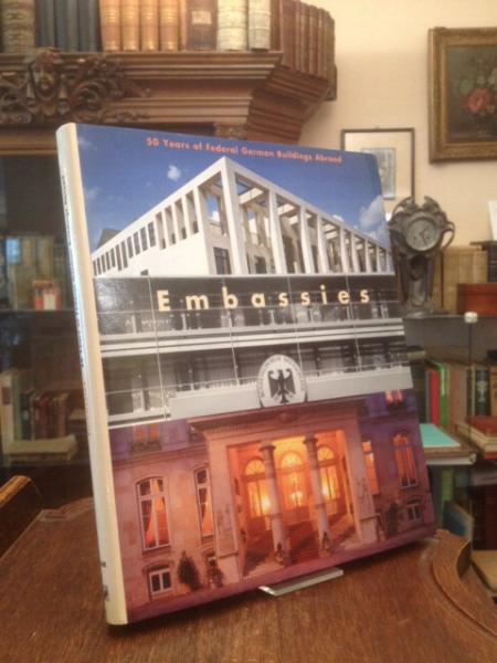 Asendorf, Olaf / Voigt, Wolfgang / Wang, Wilfried (Hrsg): Embassies : 50 years of Federal German buildings abroad. [Exhibition by German Museum of Architecture, Frankfurt/Main, July 22 until September 10, 2000 ; premises of the Federal Ministry of Transport, Building and Housing, Berlin, fall 2000 ; Art and Exhibition Hall of the Federal Republic of Germany, Bonn, March 9 until April 22,2001]. Tübingen-Berlin, Wasmuth, 2000. 4° (28x23), 255 p., many photos and ill, publisher’s hardbound with photo jacket, well cared, as new, English hardcover edition of ‚Botschaften : 50 Jahre Auslandsbauten der Bundesrepublik Deutschland‘