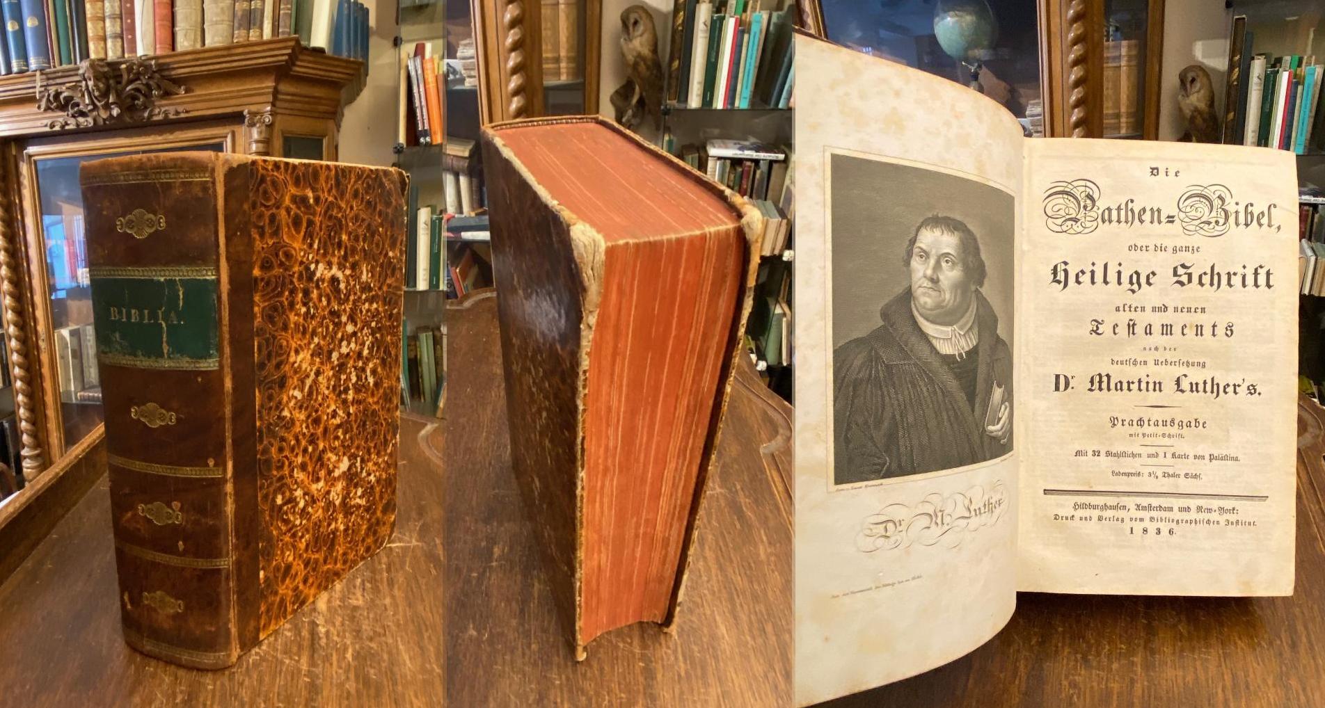 Bibel. – AT. – NT. – Luther, Martin (Üb): Die Pathen-Bibel oder die ganze Heiligen Schrift alten und neuen Testaments nach der deutschen Uebersetzung Dr. Martin Luther’s : Prachtausgabe mit Petit-Schrift. Mit 32 Stahlstichen und 1 Karte von Palästina. Ladenpreis: 31/2 Thaler Sächs. Hildburghausen; Amstersam und New-York, Druck und Verlag vom Bibliographischen Institut, 1836. gr8° (24x15), 1487 (AT), 438 (NT) Sp., 1 Bl., mit Frontispiz (Luther), 17 Kupferstichen im AT und 13 Kupferstichen im NT, 1 einfaltete Karte von Palästina 1832, marmor Hldr d.Zt. mit grüner RSchild und etwas RückengoldPrägung, dreiseitiger Rotschnitt, Ecken etwas bestossen, gering berieben, Namensstempel auf unterer Ecke des Vorsatzes, teils schwach stockfleckig, ordentliches gepflegtes Exemplar, (Pathenbibel).– [Sarkowski BI, 3 d 19].–