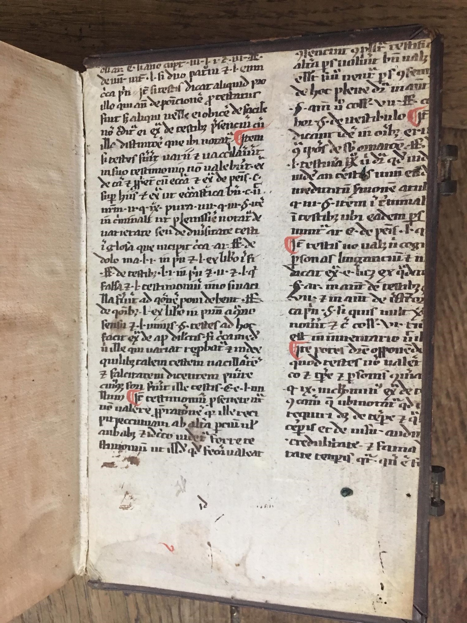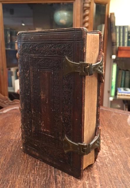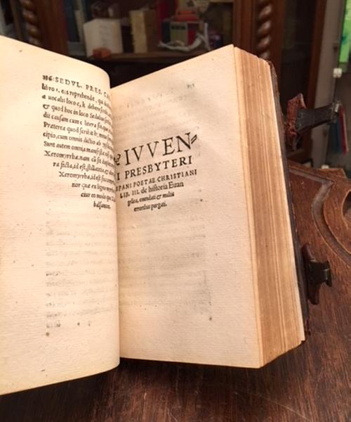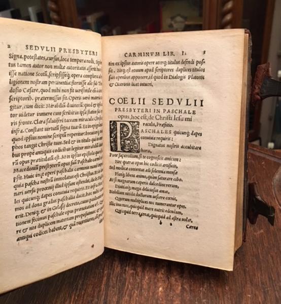 [A.] Sedulius, Caelius.– Nebrija, Elio Antonio de (Bearb) / [B.] Iuvencus, Gaius Vettius Aquilinus. – Badius Ascensius, Jodocus (Bearb): [A.] Coelii Sedulii Presbyteri cum piissimi tum doctissimi Paschale Opus, seu mirabilium divinorum libri quinqu, cum enarrationibus luculentissimis Aelii Antonii Nebrissensis. [B.] Adiunximus etiam Iuvenci Hispani Presbyteri Evangelicam Historiam eiusdem argumenti, additis et in eandem commentariis. // Omnia ad vetustissima exemplaria collata & castigata. Cum indice diligentissimo. Basileae [Basel], (apud Barptholomaeum VVesterhemerum) [Bartholomaeus Westheimer], 1541. kl8° (16x10), 1 wBl., [16], 542, [2] S., 1wBl., (= Sign. a-z8, A-M8), M8recto mit Druckerbezeichnung und M8verso mit Druckermarke (Schlange abwärts um Pfeil), blindgeprägter brauner Ledereinband d.Zt. über Holzdeckel, mit 2 intakten Messingschliessen (1 abgerissenund beiliegend), Bezug an den Kapitalen mit Fehlstellen, Innenspiegel bezogen mit einer gotischen Minuskel, Name auf Titelblatt, gutes gepflegtes Exemplar, [VD16 S 5248].– Kolophon: ‚BASILEAE, APVD BARPTHOLOMAEVM VVESTHEMERVM. ANNO M.D.XLI.‘.— Mit Einleitung von Bartholomäus Westheimer.– Enthält neben Sedulius und Iuvencus ausserdem Auszüge aus Epigrammata von Prosper Aquitanus und aus De scriptoribus ecclesiasticis von Johannes Trithemius.–– [A.] Caelius (auch Coelius) Sedulius (+ um 450) war ein lateinisch-christlicher Dichter des 5. Jahrhunderts.– Als sein Hauptwerk gilt das Paschale Carmen, das in fünf Büchern die Evangelien von der Geburt Christi bis zur Himmelfahrt in Hexametern nacherzählt.— [B.] Gaius Vettius Aquilinus Juvencus war ein hispanischer Presbyter, der zur Zeit Konstantins des Großen (306–337) lebte und neben Commodian (um 270) der erste namentlich bekannte christliche Dichter.– Von seinen beiden nachgewiesensen Epen ist nur erhalten das Werk ‚Evangeliorum libri quattuor‘ (Vier Bücher der Evangelien). Dieses Epos ist eine Evangelienharmonie in insgesamt etwa 3200 Hexametern, die sich vor allem auf das Evangelium nach Matthäus, in Teilen auch auf die Evangelien nach Lukas und Johannes stützt. Es fand schnell weite Akzeptanz in der christlichen Gelehrtenwelt. Vor allem in der Zeit der Karolinger wurde das Werk häufig rezipiert, wie die zahlreichen Handschriften aus dem 9. Jahrhundert zeigen. Erstmals gedruckt wurden die Evangeliorum libri um 1490.