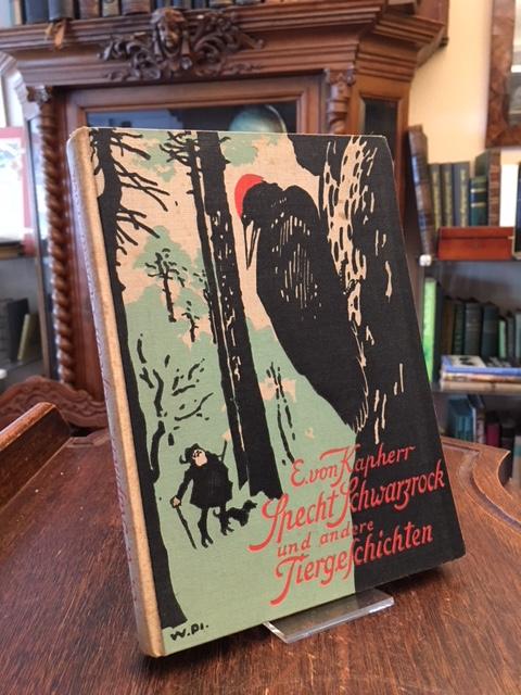 Kapherr, Egon [Freiherr] von: Specht Schwarzrock und andere Tiergeschichten. mit 3 Bunt- und 2 Tonbildern von H. Pfendsack. Stuttgart, Loewes Verlag Ferdinand Carl, [1931]. 8° (20x15), 128 S., Oln mit geprägtem farb Deckelbild, etwas angeschmutzt, Schnitt mit Braunfleck, urchgestrichener Name auf Innenspiegel, Titelei schwach stockfleckig, gutes Exemplar, Einband-Illustration von Willy Planck.–