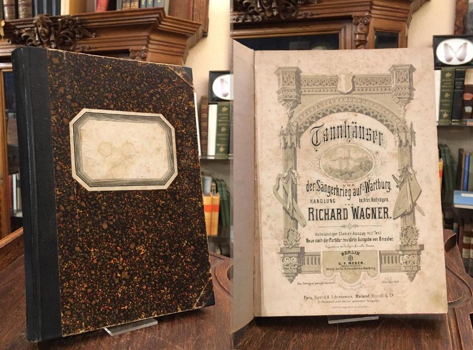 Wagner, Richard (1813 – 1883) / Brissler, Friedrich Ferdinand (1818 – 1893): Tannhäuser und der Sängerkrieg auf der Wartburg : Handlung in drei Aufzügen. Vollständiger Clavier-Auszug mit Text. Neue nach der Partitur revidierte Ausgabe von Brissler. Berlin, C.F. Meser (Adolf Fürstner) : Königl. Sächs. Hofmusikalien-Handlung, (VN A 2900 F) [um 1860]. 4° (27x19) 273 S., farb lith Titelblatt, etwas späterer marmor Hln, erstes und letztes Blatt schwach stockfleckig, anfangs etwas fingerfleckig, gutes festes und sauberes Exemplar,