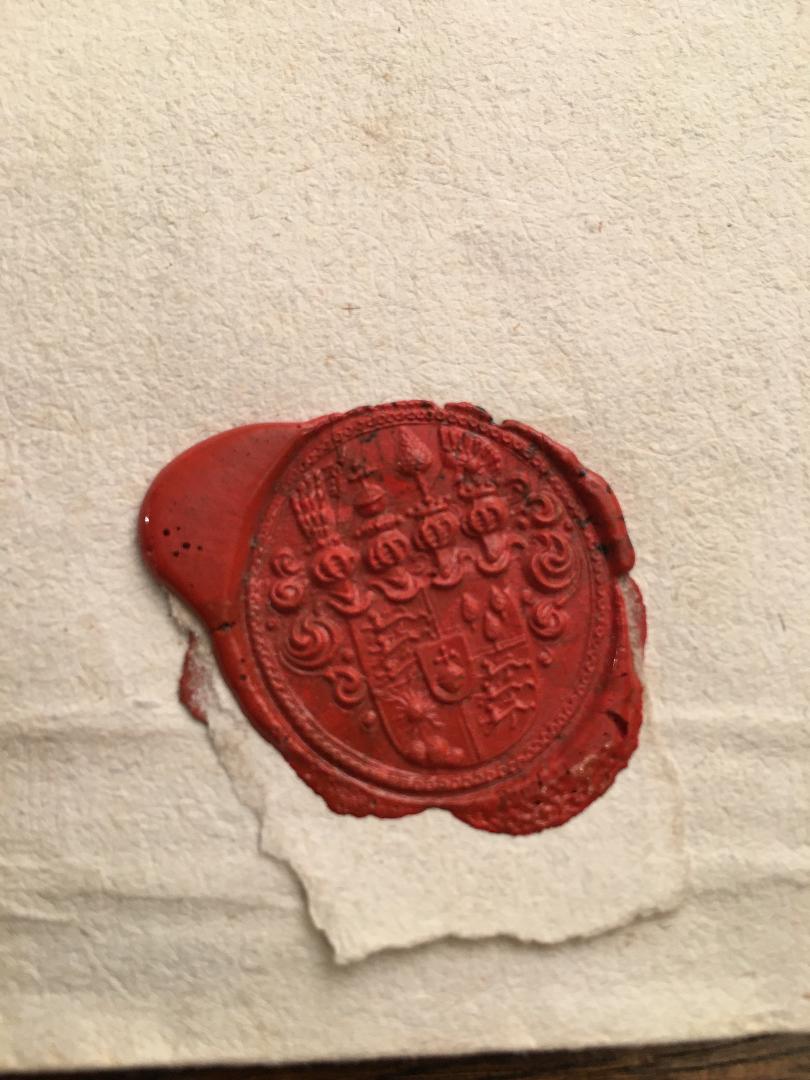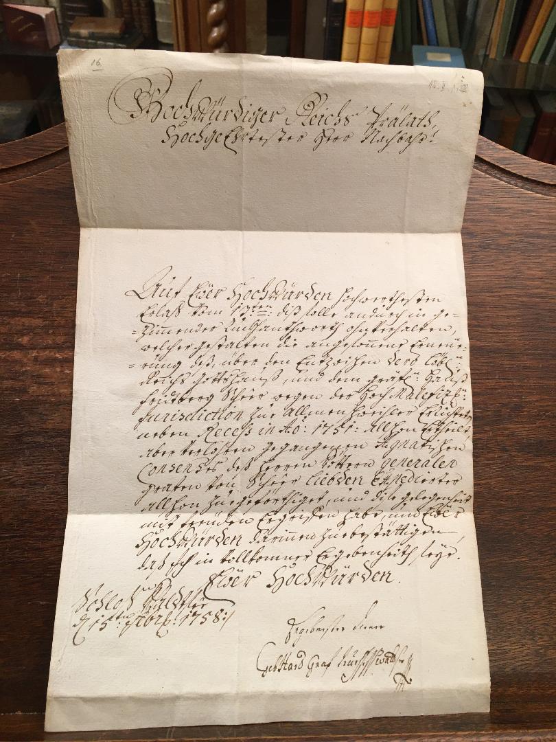 Haus Waldburg-Wolfegg-Waldsee, 1758. – Brief. – ‚Dem Hochwürdigen / Herren Nicolao deß Heyl: Röm. Reichs Gotts Hauß / Schußenried Abbten. / Meinem HochgeEhrtesten Herr Nachbahren. / Schußenriedt‘ : Brief-Doppelbogen, Bütten mit Wasserzeichen, 1 S. beschrieben mit akurater Handschrift in brauner Tinte, als Brief gefaltet mit fürstlichem Wachssiegel. [Bad] Waldsee, Schloss, 15. Februar 1758. 4° (35x22), sehr guter Zustand, Lieferung in archivbeständiger Urkundenmappe.—