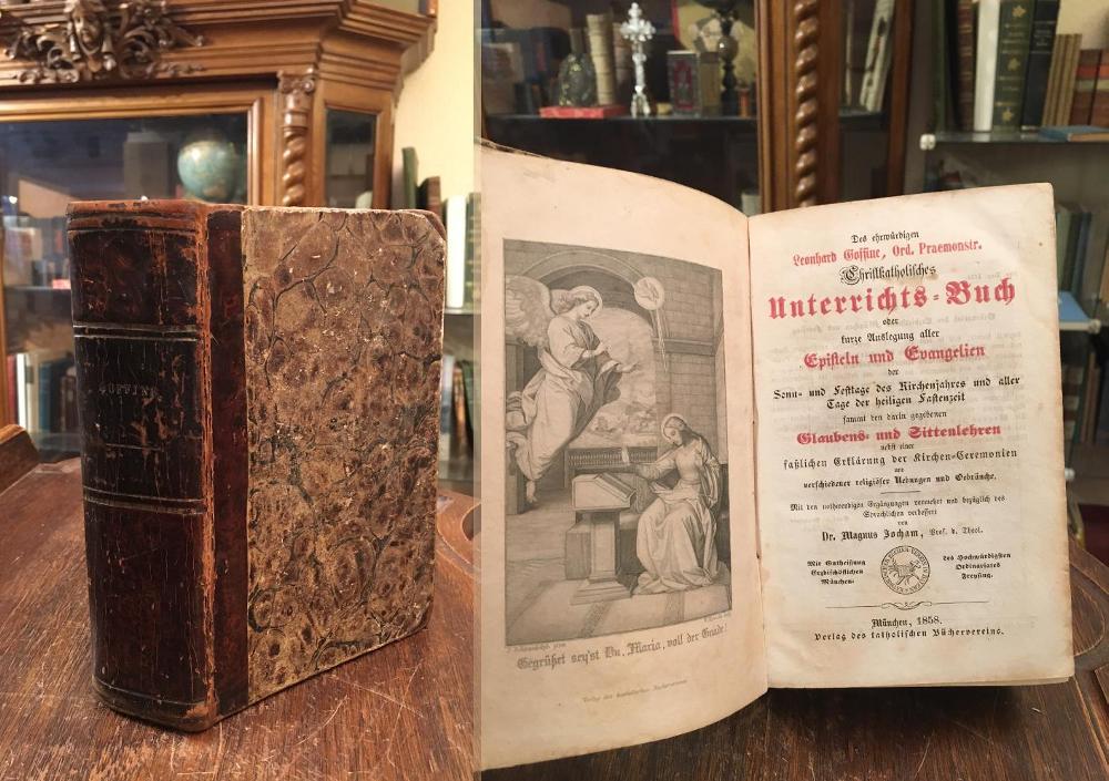 Goffine OPraem, R.P. : Handpostille / Jocham, Magnus (Bearb): Christkatholisches Unterrichts-Buch oder kurze Auslegung aller Episteln und Evangelien der Sonn- und Festtage des Kirchenjahres und aller Tage der heiligen Fastenzeit sammt der darin gegebenen Glaubens- und Sittenlehren nebst einer faßlichen Erklärung der Kirchen-Ceremonien und verschiedener religiöser Uebungen und Gebräuche. Mit den nothwendigen Ergänzungen vermehrt und bezüglich des Sprachlichen verbessert von Magnus Jocham. München. Verlag des katholischen Büchervereins, 1858. 8° (18x12), XLVIII, 864 S., mit gestochenem Frontispiz auf stärkerem Papier, Hldr d.Zt. mit RTitel und etwas RVergoldung, Ecken/Kanten bestossen, etwas berieben, Papier teils etwas braunfleckig, ordentliches festes Exemplar,