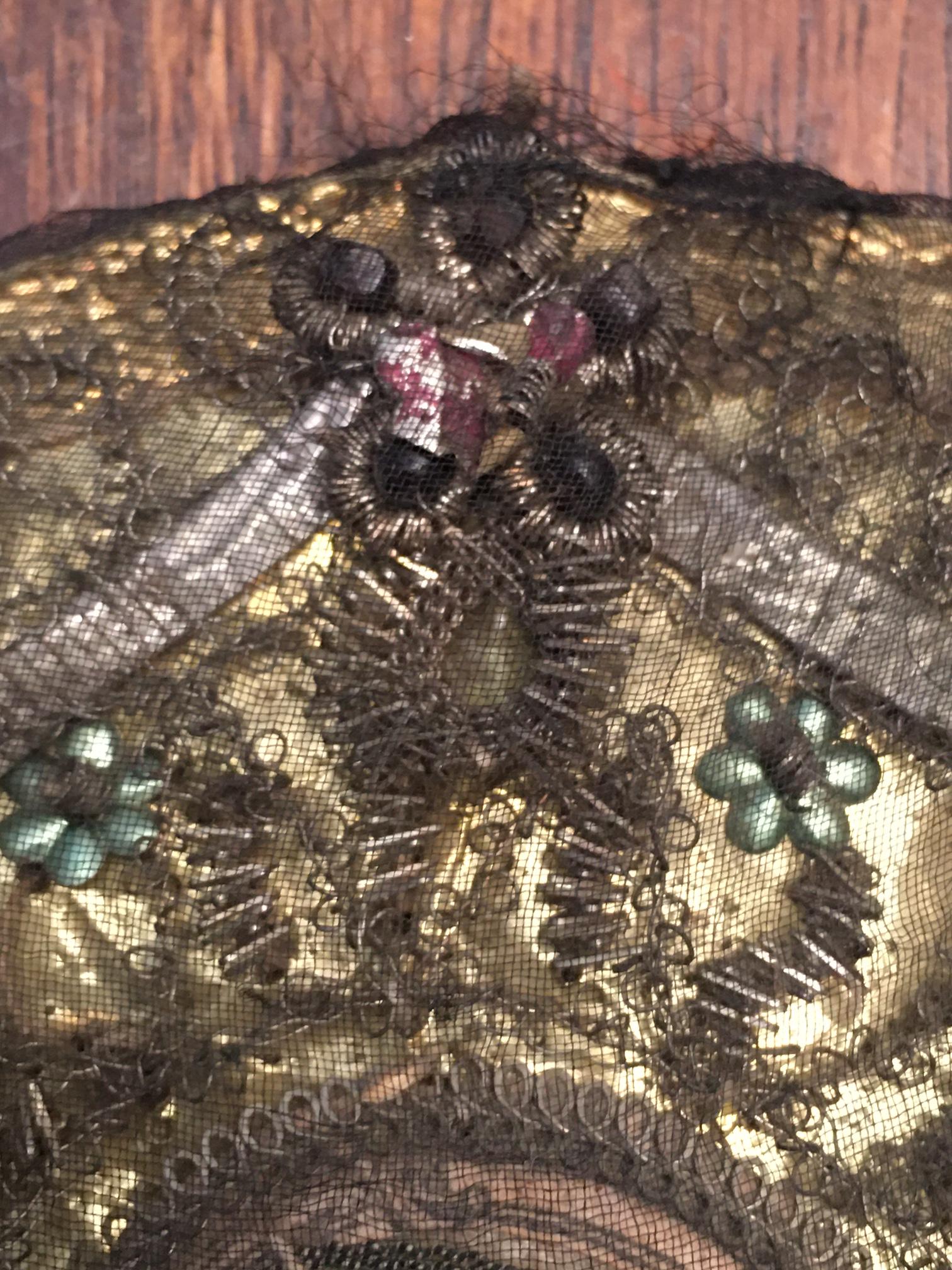 Devotionalien. – Klosterarbeit. – Elisabetha Bona / Achler, Elisabeth (1386-1420). – Klosterarbeit in halbrunder Form : mittig Medaillon mit dem Bildnis der Guten Beth, stigmatisiert ein Kreuz haltend, Gouache auf Papier auf Textilien, umgeben von feinen Drahtarbeiten Schmucksteinen, Granatkugeln, Filz- oder Haarkugeln. Untergrund aus goldener Folie, das Ganze unter schwarzer Gaze.– Kloster Reute, 18./19. Jahrhundert. Masse 13 x 10 cm,