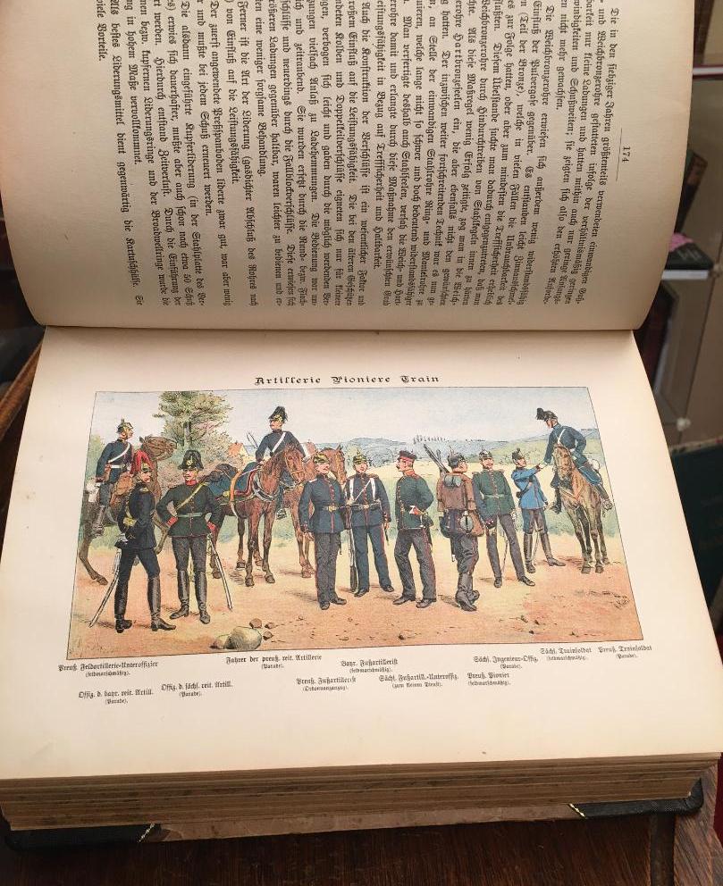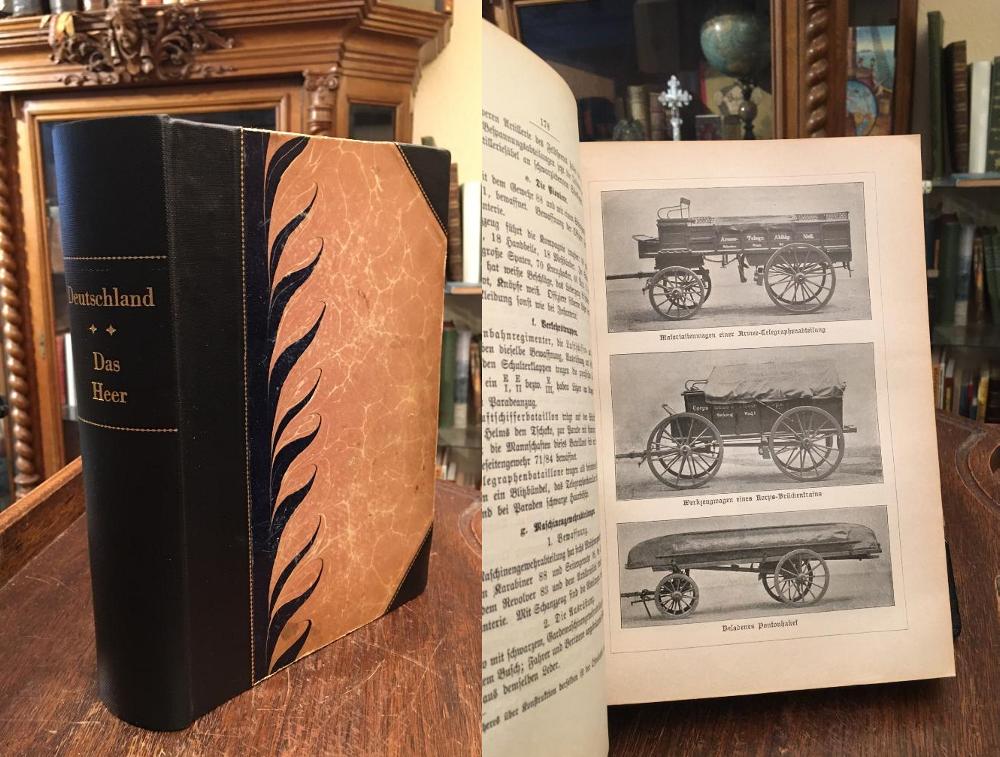 Boeck, [Fritz] von der: Deutschland : Das Heer : Dritte Ausgabe. (Mit einem Vorwort des Herausgebers Constantin von Zepelin). Berlin, Verlagsbuchhandlung Alfred Schall, [1904]. 4° (25x18), XVI, 414 S., mit 15 Abb. im Text sowie 34 Tafeln (davon 11 von Richard Knötel in Chromolithographie ), marmot Hln mit LnEcken: aufwendige Neuaufbindung unter Verwendung der alten Materialien und Schmuckvorsätze, sowie Beibehaltung des alten Schnittes, neuer goldRTitel und goldFiletten, Name mit Bleistift auf Vorsatz, Papier etwas gebräunt, schönes gepflegtes Exemplar, ANGEBUNDEN: Friedag, B.: Führer durch Heer und Flotte 1905. Berlin, Alfred Schall, [1904]. VII, 249 S.–
