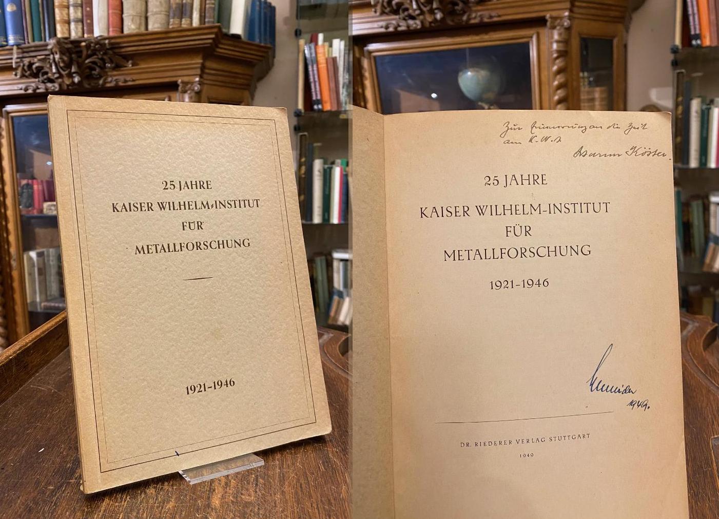 25 Jahre Kaiser Wilhelm-Institut für Metallforschung 1921 – 1946. Stuttgart, Dr. Riederer Verlag, 1949. 4° (25x18), 167 S., mit zahlr. Abb., OKart (Brosch), etwas gebräunt, sauber und wohlerhalten, mit handschriftlicher Widmung des Institutleiters Werner Otto Köster (1896-1989): ‚Zur Erinnerung an die Zeit am K.W.I. / Werner Köster‘