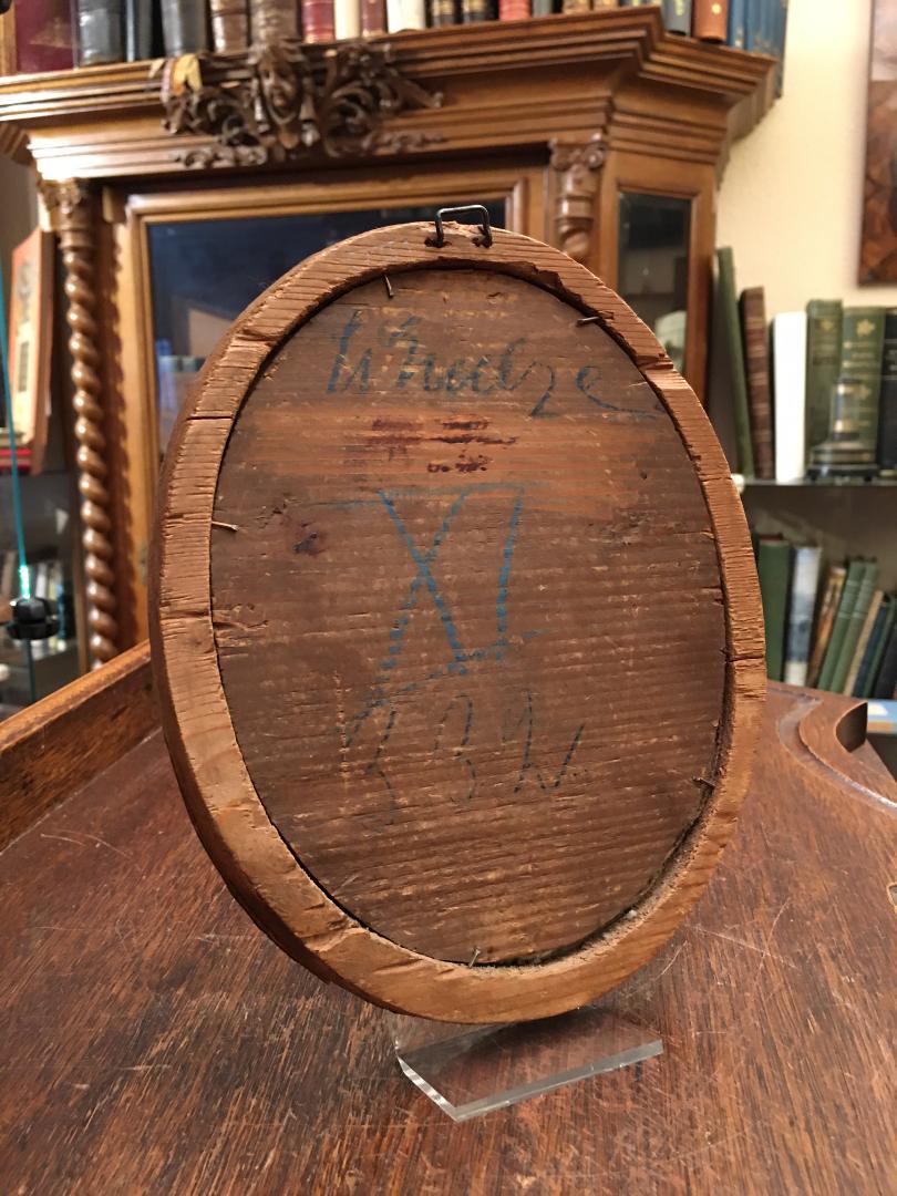 Devotionalien. – Klosterarbeit. – Benno von Meissen (um 1010 – 1106): Klosterarbeit in rundem Eichenrahmen : mittig Bildnis des Hl. Benno, dargestellt als Bischof mit Bischofsstab und Fisch mit Schlüssel, farbige Gouache auf Papier in feinster Qualität, umgeben von feiner Stickerei und Drahtarbeiten mit Goldfäden, Metallplättchen als Blüten auf Textil, das Ganze alt gerahmt unter Glas in ovalem Eichenrahmen. Süddeutsch, um 1750. Masse 20 x 16 cm,