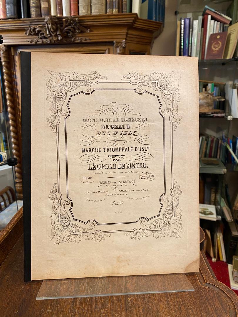 Meyer, Leopold von (1816-1883): Monsieur Le Marechal Bugeaud Duc d’Isly : Marche Triomphale d’Isly composee par Leopold de Meyer, Pianist de sa Majestee l’empereur d’Austriche : Op 30. Berlin, chez Stern & Co / (Paris, chez Messonier / London, chez Cramer & Beale / Milan, chez Lucca), (PN 38) [1844]. 4° (31x25), 13 S., Umschlag und Noten gestochen, OKart (Brosch) mit Titel im Schmuckrahmen, Heftstreifen, gering angestaubt, untEcke mit kleinem Fleck, gutes gepflegtes Exemplar,
