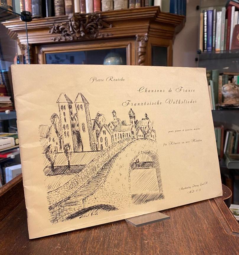Roueche, Pierre: Chanson de France pour piano a quatre mains / Französische Volkslieder für Klavier zu vier Händen. Vorwort von Wolfgang Teubner, Leiter der Musikschule Herrenberg. Illustrationen von Michael Gompf. Herrenberg, Musikverlag Döring, (VN MD 4125) 1978. 4°quer (21x30), 41 S., ill OKart (Brosch), Schnitt etwas angeschmutzt, vereinzelte Bleistifteintragungen, Parallelausgabe französisch – deutsch.–