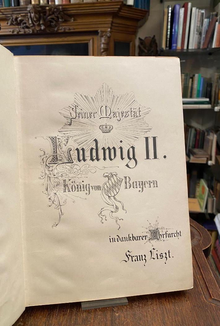 Liszt, Franz (1811-1886) / Roquette, Otto (1824-1896) (Libretto): Die Legende von der heiligen Elisabeth : Oratorium vom F. Liszt : Klavier-Auszug. Leipzig, C.F. Kahnt Nachf / Stich und Druck der Röder’schen Officin in Leipzig, (VN 2555.1156, 1156) [1867]. 4° (27x20), 2 Bl., 195 S., schwarzer Ln d.Zt. mit goldTitel, Titel und Widmungsblatt an Ludwig II. von Bayern kalligraphiert, Preisangabe auf dem Titel M. 8.– n., untere Ecke schwach fingerfleckig, gutes Exemplar,