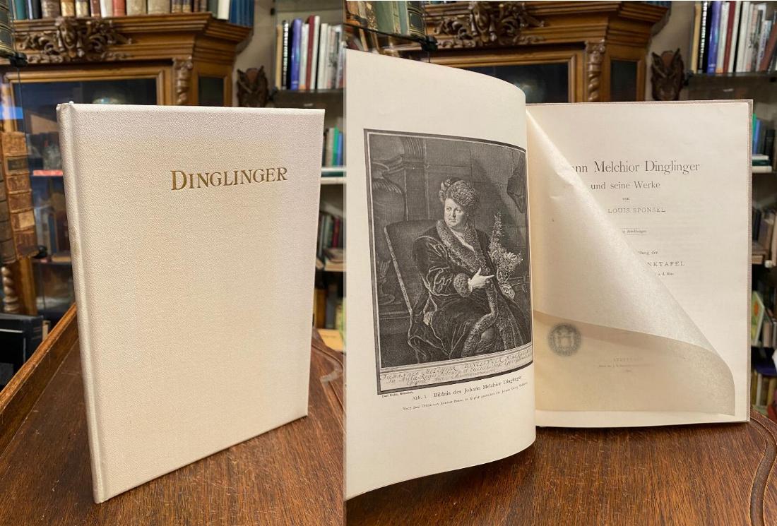Dinglinger, Johann Melchior (1664-1731). – Sponsel, Jean Louis: Johann Melchior Dinglinger und seine Werke. Aus Anlass der Enthüllung der Dinglinger-Gedenktafel am Geburtshause der Künstlers in Biberach a. d. Riss gewidmet von dem Vorsitzenden des Vereins der Juweliere, Gold- und Silberschmiede Württembergs, Emil Foehr-Stuttgart. Stuttgart, Druck der J.B. Metzler’schen Buchdruckerei, 1904. 4° (27x20), 69 S., mit 20 Abb., weisser Oln mit goldTitel, weisse MoireeVorsätze, dreiseitiger goldSchnitt, Einband minimal lichtverfärbt, kleine Bereibung am Rücken, sonst tadellos, aus der Bibliothek Schloss Altshausen mit Papiersiegel-Exlibris von Robert Herzog von Württemberg