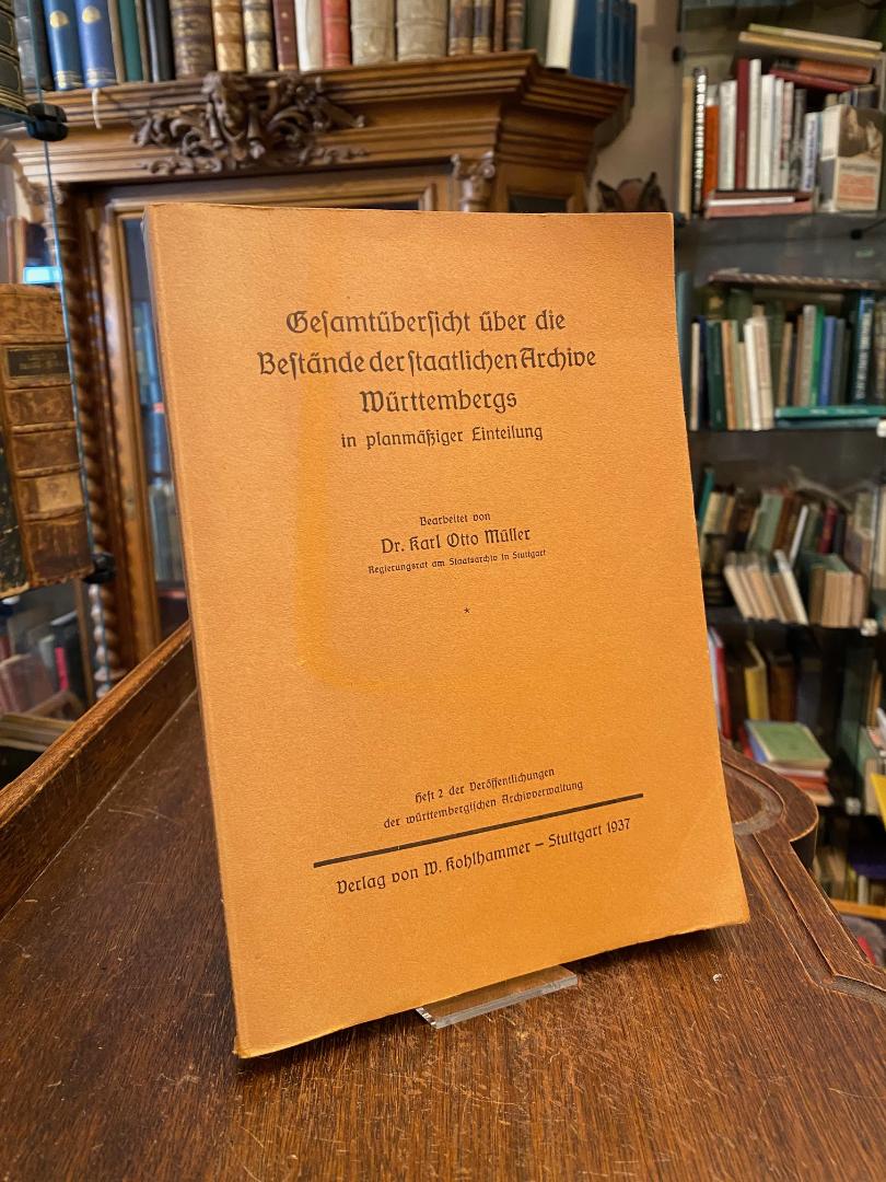Müller, Karl Otto: Gesamtübersicht über die Bestände der staatlichen Archive Württembergs in planmäßiger Einteilung. Mit einer Übersicht über die Geschichte der württembergischen staatlichen Archive und einer Liste der württembergischen staatlichen Archivare. Stuttgart, Verlag von W. Kohlhammer, 1937. 4° (25x18), X, 237 S., OKart (Brosch), unbeschnitten/unaufgeschnitten, etwas lichtrandig, offensichtlich ungelesen, [= Veröffentlichungen der Württembergischen Archivverwaltung; 2),