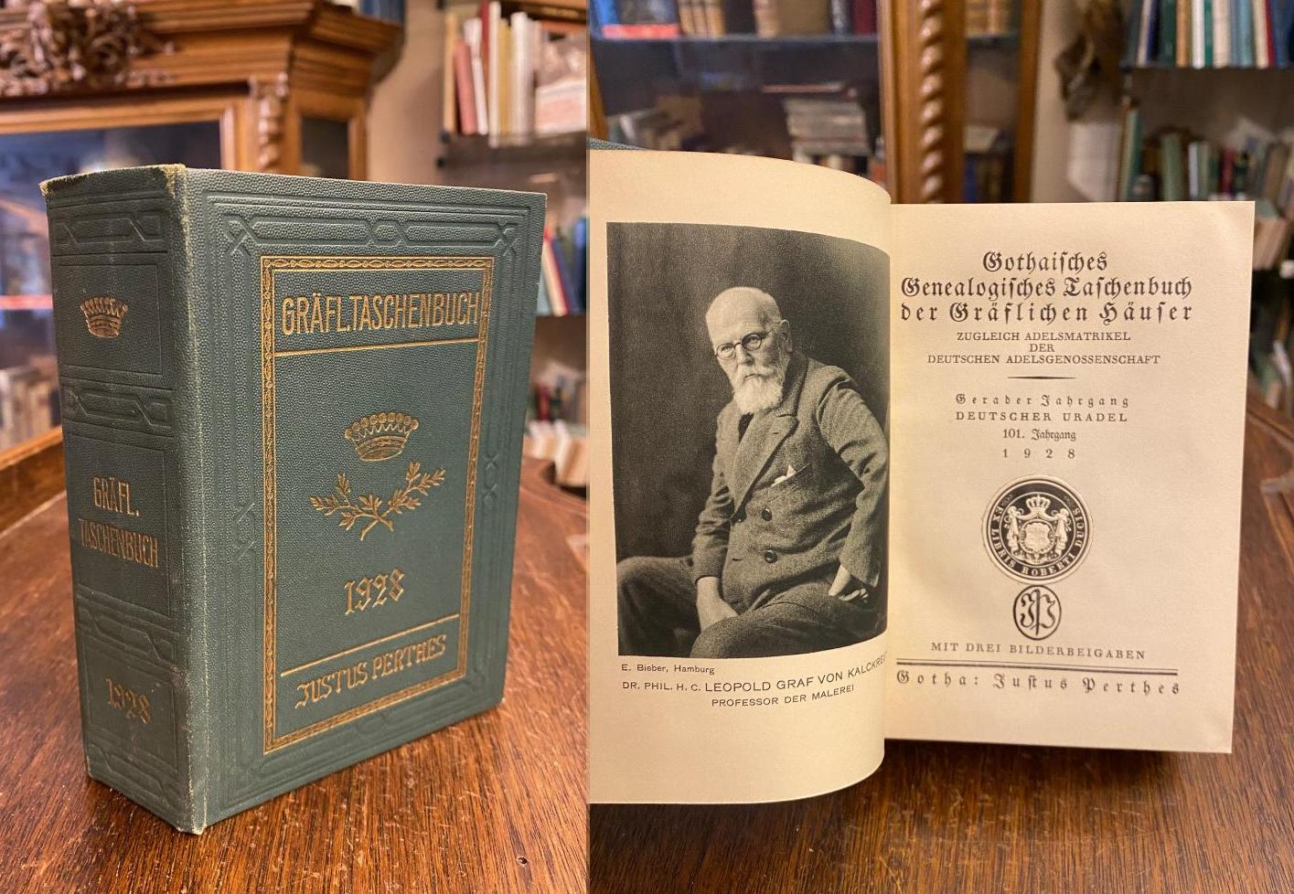 Gotha Gräfliche Häuser 1928. – Gothaisches Genealogisches Taschenbuch der Gräflichen Häuser 1928 : 101. Jahrgang : Zugleich Adelsmatrikel der Deutschen Adelsgenossenschaft. Gerader Jahrgang: Deutscher Uradel. Gotha, Justus Perthes, (1927). 12° (15x10), XVIII, 689 S., mit 3 Tafeln (FrontispizPorträt und 2 farb Wappen), dunkelgrüner Oln mit goldPrägung, Schnitt etwas angestaubt, kaum genutzt, gutes gepflegtes Exemplar, [= Gotha Gräfliche Häuser; Jg. 101 (1928)] [Fritsch; 474].– Einbandtitel ‚Gräfl. Taschenbuch‘.–