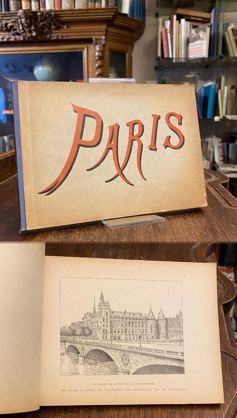 Paris : 30 Vues – 30 Views – 30 Ansichten. Corbeil, Imprimerie Crete, (1889). 8°oblong (13x19), [2], 30, [2] p., avec 30 gravures noir et blanc, reliure d’editeur souple avec titre rouge, dos en toile, jauni, bon et solide, Provenance: bibliotheque ducale de chateau Altshausen avec ex-libris de Robert Duc de Wurtemberg.–