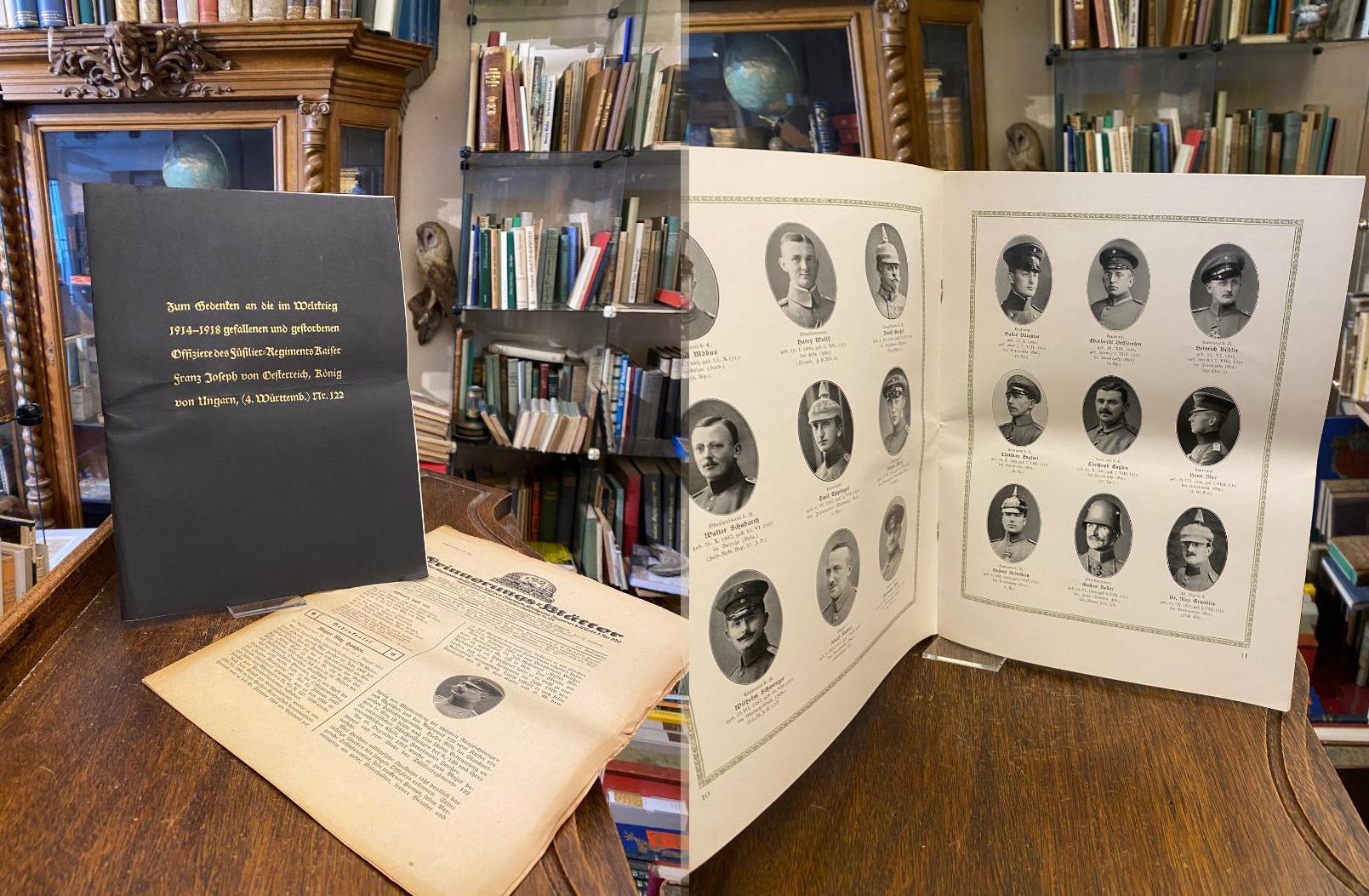Triebig, von (Generalleutnant a. D. im Namen des Offiziervereins Füsilier-Regiments Nr. 122) (Vorwort): Zum Gedenken an die im Weltkrieg 1914 – 1918 gefallenen und gestorbenen Offiziere des Füsilier-Regiments Kaiser Franz Joseph von Oesterreich, König von Ungarn, (4. Württemb.) Nr. 122. Stuttgart, Ernst Klett, Buchdruckerei Zu Gutenberg, (1931). 4° (30x23), 19, (1) S., Vorwort sowie 17 Tafeln mit 153 Porträts mit Namen und Lebensdaten, scharze OKart (Brosch) mit goldTitel, mittig leichte Faltspur, fest sauber und gepflegt, dazu: Erinnerungsblätter des Füsilier-Regiments Kaiser Franz Joseph von Oesterreich, König von Ungarn, (4. Württemb.) Nr. 122 : Vereinsblatt des Offiziervereins : Nr. 12. Jg. 40, Stuttgart, 1. Dezember 1931, S. [381] – 396.–
