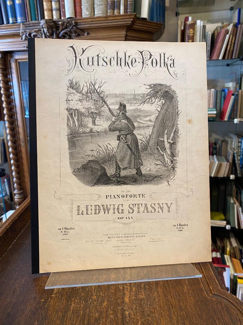 Stasny, Ludwig (1823-1883). – Kutschke-Polka : für das Pianoforte (zu 2 Händen) von Ludwig Stasny : Op. 155. Mainz, Bei B. Schott’s Söhnen / Brüssel, Gebrüder Schott / London, Schott & Cie / Paris, Schott / Vollständiges Auslieferungslager: Leipzig, C. Fleede, (VN 20497) [1871]. 4° (33x26), 3 S., OKart (Brosch), Heftstreifen, mit lithographierter Umschlagillustration, minimal fleckig, Studium in Prag, 1847-1864 Militärkapellmeister beim Infanterie-Regiment Nr. 11, 1864-1868 beim Infanterie-Regiment Nr. 75.– ab 1871 Kapellmeister im ‚Palmengarten‘ in Frankfurt.– Stany komponierte mehr als 200 Werke. –