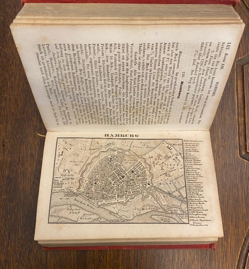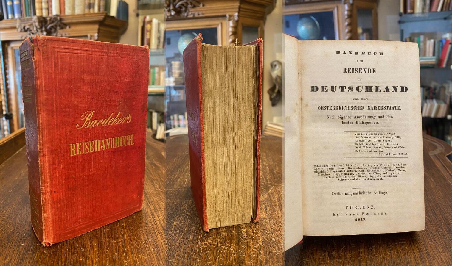 Hinrichsen D 40b.– Handbuch für Reisende in Deutschland und dem Oesterreichischen Kaiserstaate : Nach eigener Anschauung und den besten Hülfsquellen. 3., umgearbeitete Aufl., Coblenz, bei Karl Baedeker, 1847. kl8° (16x11), 2 Bl., X, 684 S., mit 20 (16 ganz- und 4 doppelseitigen) Stadtplänen, 4 ganzseitigen Karten, 1 Grundriss im Text, sowie 1 mehrfach gefaltete Übersichtskarte am Schluß des Bandes, (so komplett), roter Oln mit goldTitel, gelbe Lackvorsätze (vordVorsatz verso mit Verlagsverzeichnis Reisehandbücher), hinterer Rückenfalz minimal verletzt, Ecken leicht bestossen, Papier teils leicht braunfleckig, die große Übersichtskarte auf dünnes Gewebe geschottet (so wohl original), außergewöhnlich gut erhaltenes Exemplar dieser extrem frühen Ausgabe, [Hinrichsen D 40b].– kollationiert auf Vollständigkeit!